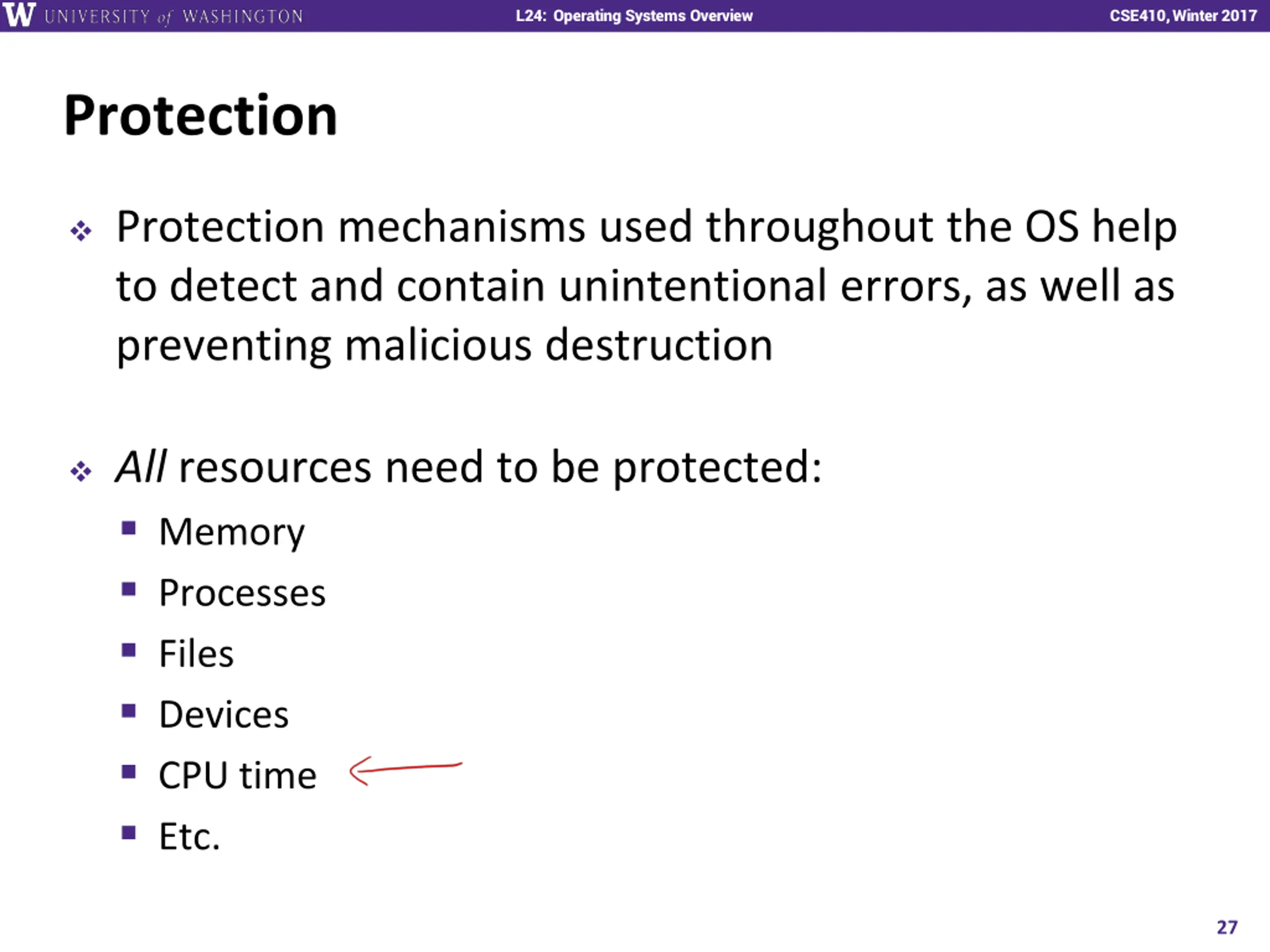 L01: Intro, Combinational Logic L24: Operating Systems Overview CSE369, Autumn 2016 CSE410, Winter 2017 Protection Protection mechanisms used throughout the OS help to detect and contain unintentional errors, as well as preventing malicious destruction All resources need to be protected: Memory Processes Files Devices CPU time Etc. 27