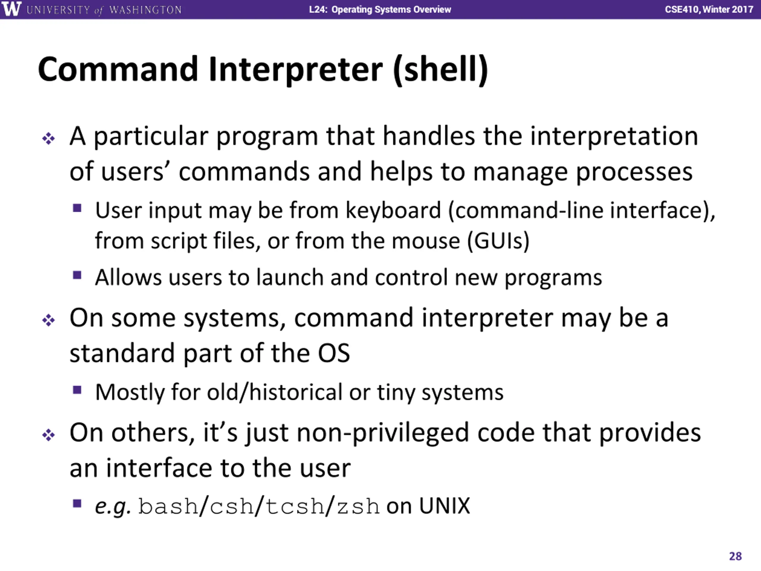 L01: Intro, Combinational Logic L24: Operating Systems Overview CSE369, Autumn 2016 CSE410, Winter 2017 Command Interpreter (shell) A particular program that handles the interpretation of users commands and helps to manage processes User input may be from keyboard (command-line interface), from script files, or from the mouse (GUIs) Allows users to launch and control new programs On some systems, command interpreter may be a standard part of the OS Mostly for old/historical or tiny systems On others, it s just non-privileged code that provides an interface to the user e.g.bash/csh/tcsh/zsh on UNIX 28