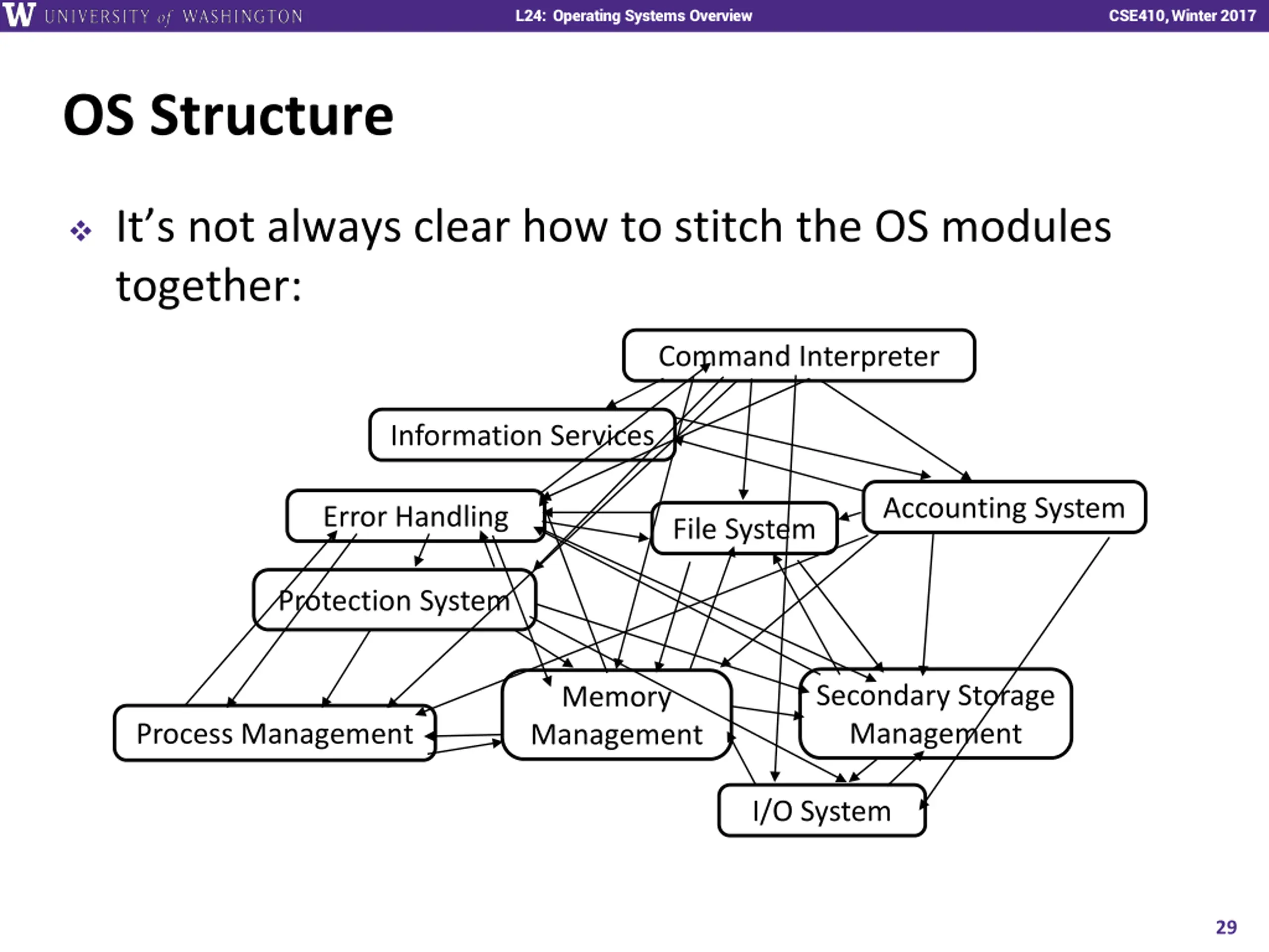 L01: Intro, Combinational Logic L24: Operating Systems Overview CSE369, Autumn 2016 CSE410, Winter 2017 OS Structure It s not always clear how to stitch the OS modules together: Command Interpreter Information Services Accounting System Error Handling File System Protection System Secondary Storage Management Memory Management Process Management I/O System 29