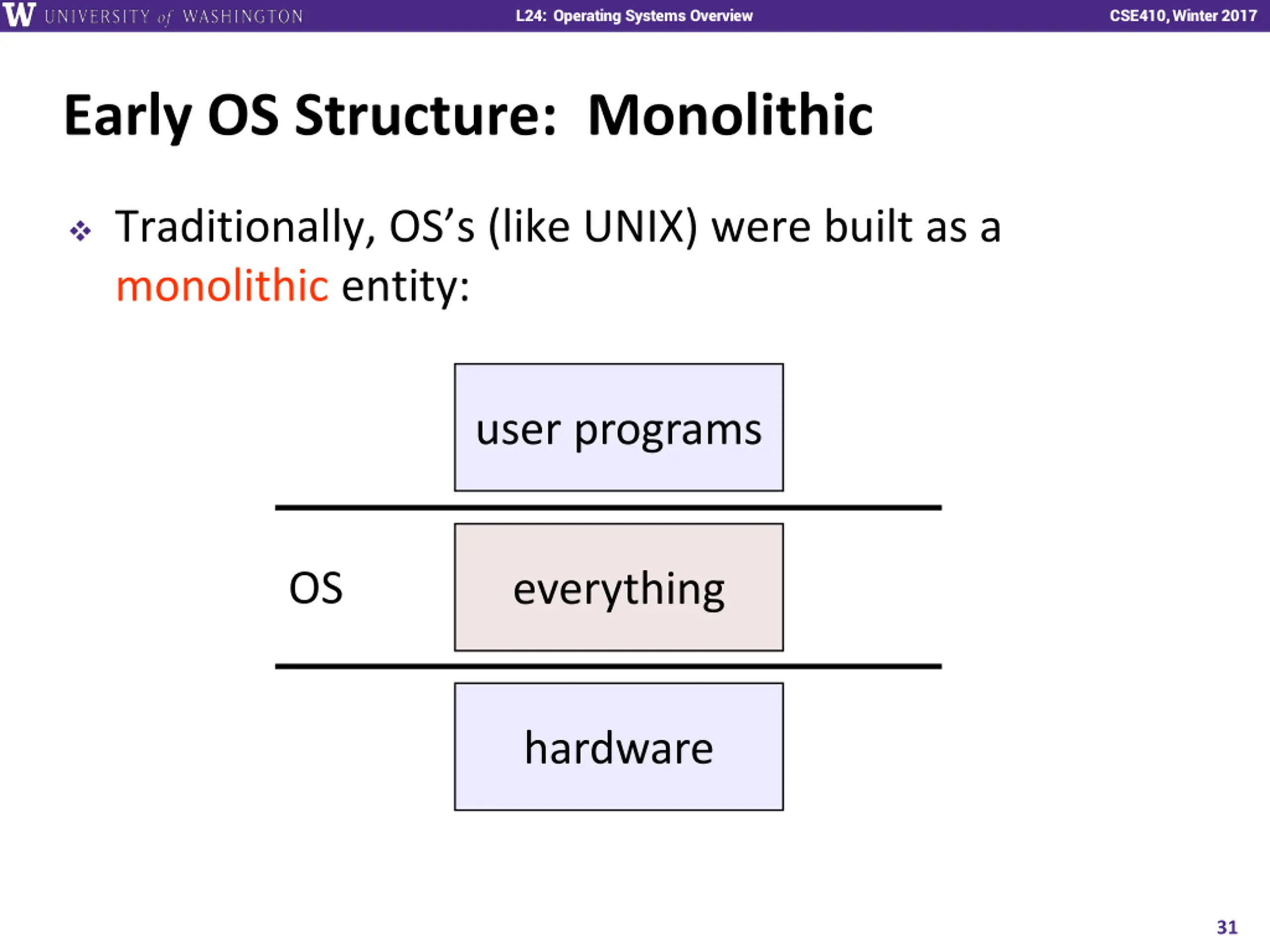 L01: Intro, Combinational Logic L24: Operating Systems Overview CSE369, Autumn 2016 CSE410, Winter 2017 Early OS Structure: Monolithic Traditionally, OS s (like UNIX) were built as a monolithic entity: user programs OS everything hardware 31