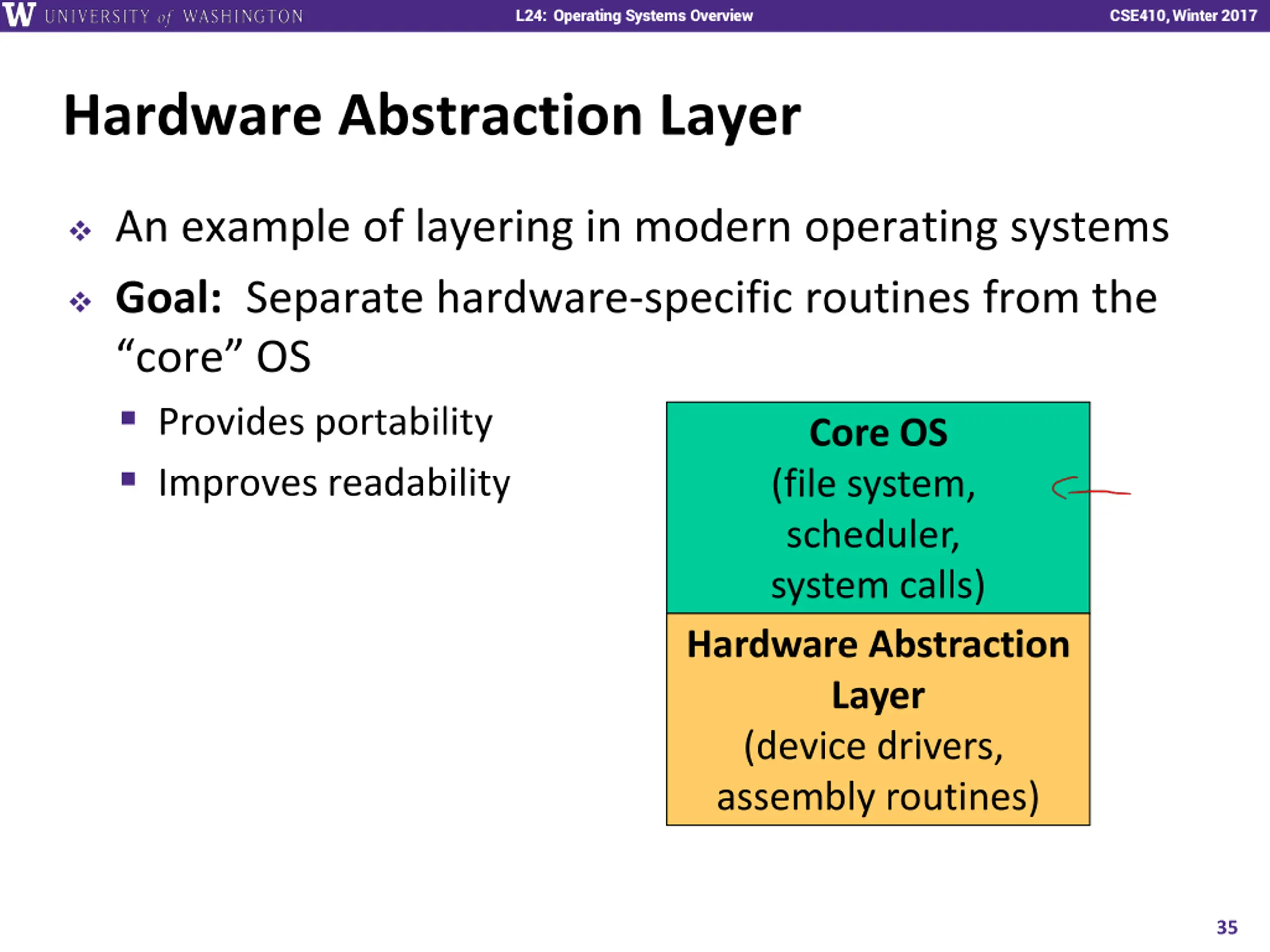 L01: Intro, Combinational Logic L24: Operating Systems Overview CSE369, Autumn 2016 CSE410, Winter 2017 Hardware Abstraction Layer An example of layering in modern operating systems Goal: Separate hardware-specific routines from the core OS Provides portability Improves readability Core OS (file system, scheduler, system calls) Hardware Abstraction Layer (device drivers, assembly routines) 35