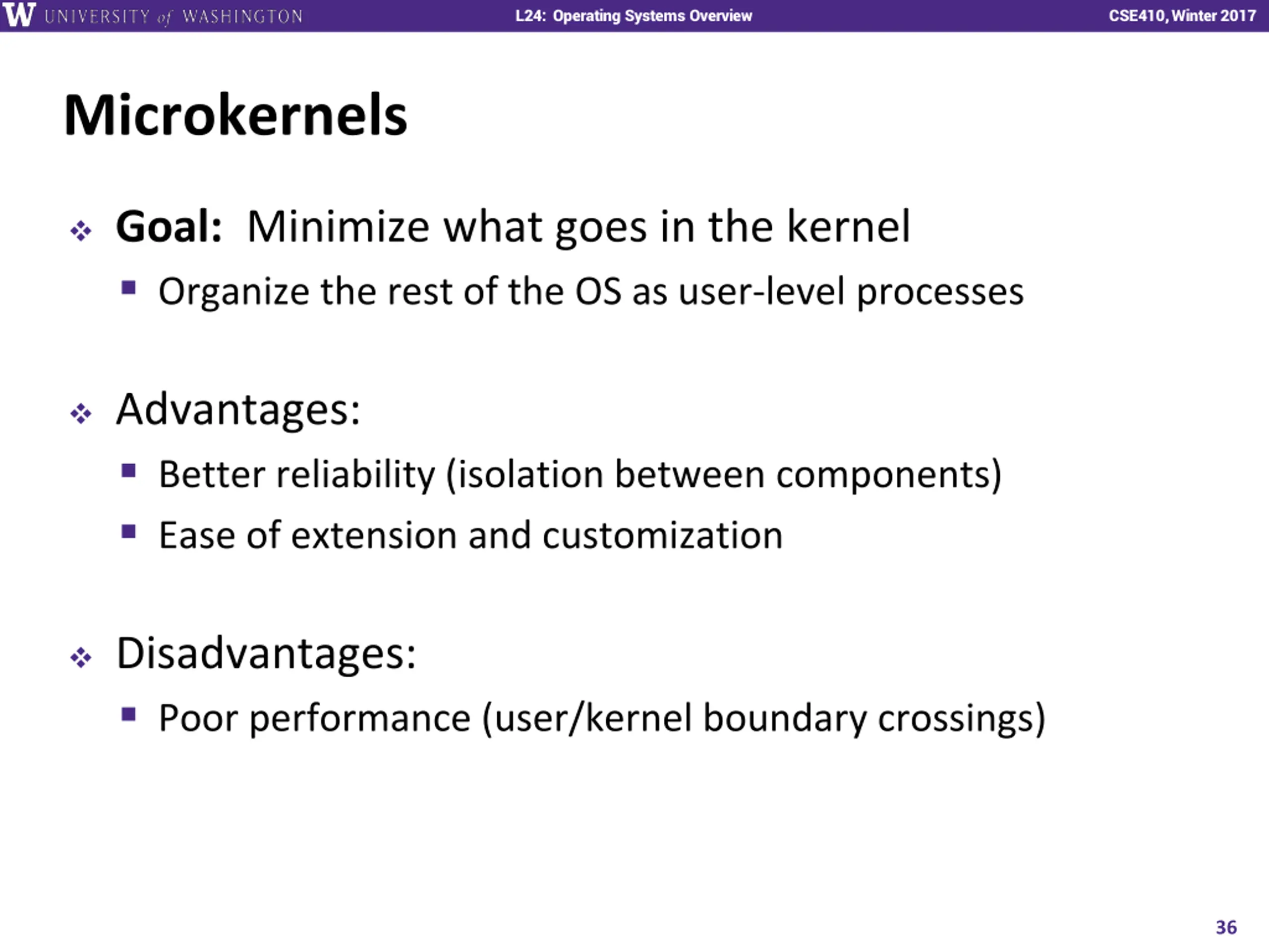 L01: Intro, Combinational Logic L24: Operating Systems Overview CSE369, Autumn 2016 CSE410, Winter 2017 Microkernels Goal: Minimize what goes in the kernel Organize the rest of the OS as user-level processes Advantages: Better reliability (isolation between components) Ease of extension and customization Disadvantages: Poor performance (user/kernel boundary crossings) 36