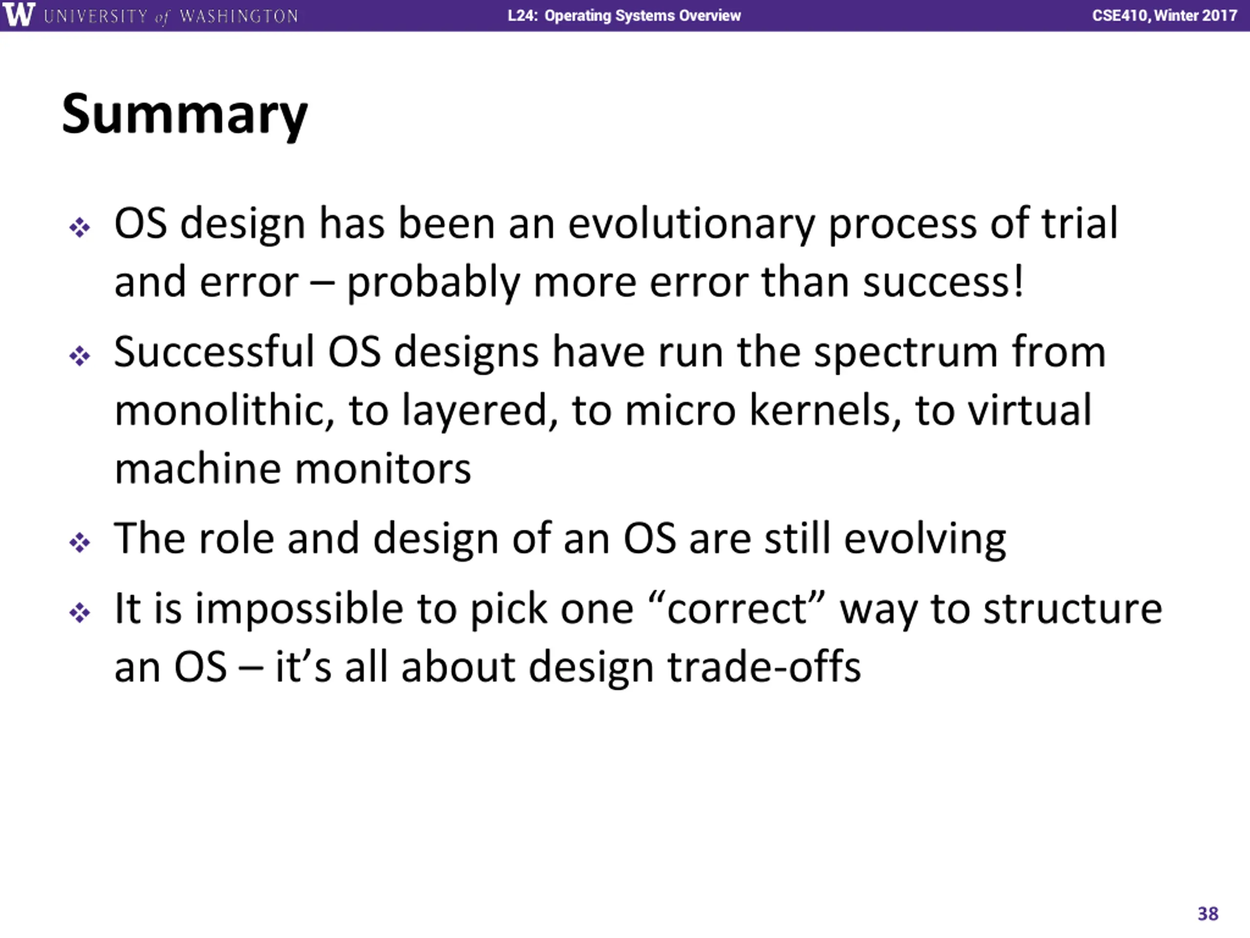L01: Intro, Combinational Logic L24: Operating Systems Overview CSE369, Autumn 2016 CSE410, Winter 2017 Summary OS design has been an evolutionary process of trial and error probably more error than success! Successful OS designs have run the spectrum from monolithic, to layered, to micro kernels, to virtual machine monitors The role and design of an OS are still evolving It is impossible to pick one correct way to structure an OS it s all about design trade-offs 38