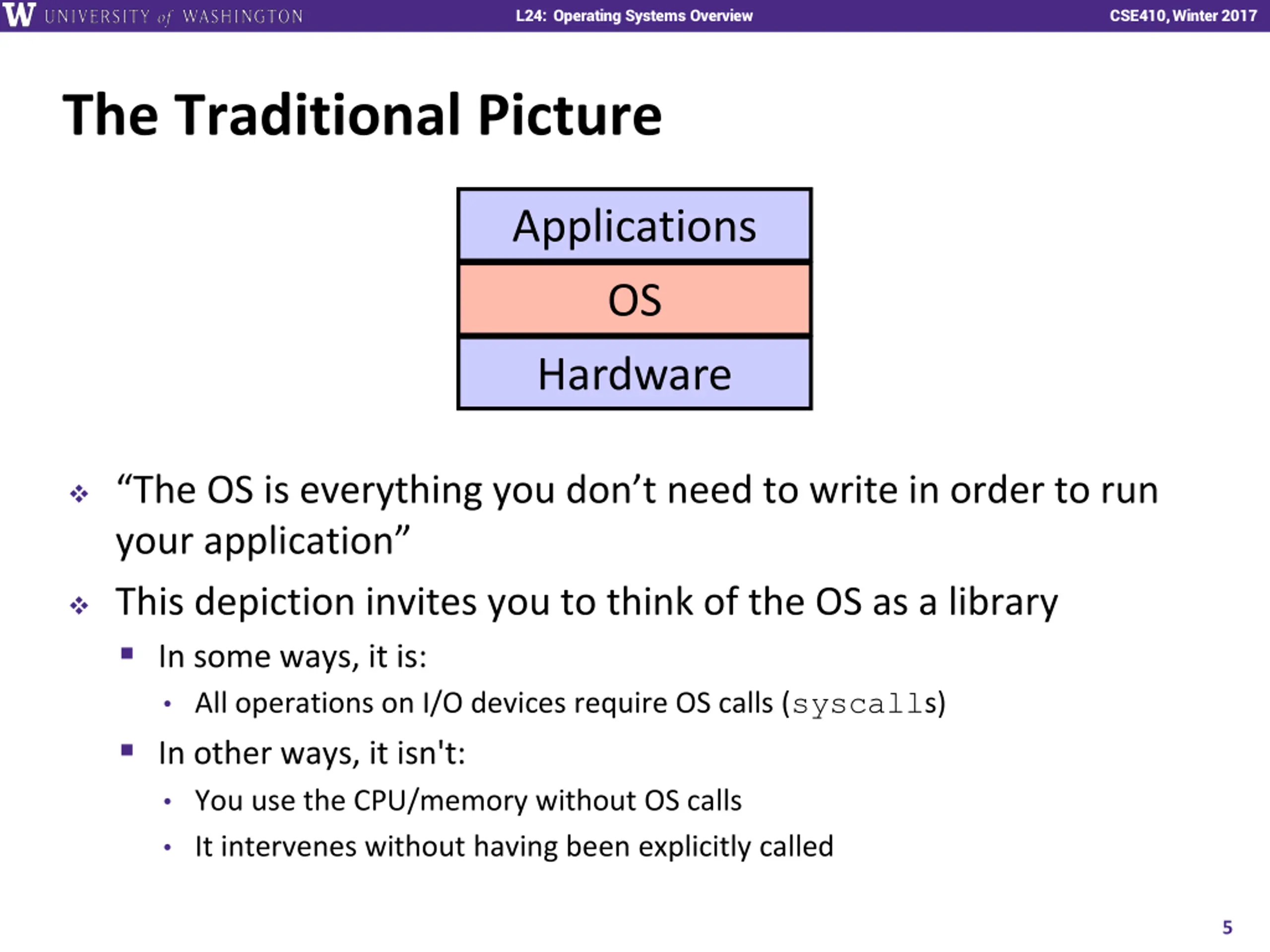 L01: Intro, Combinational Logic L24: Operating Systems Overview CSE369, Autumn 2016 CSE410, Winter 2017 The Traditional Picture Applications OS Hardware The OS is everything you don t need to write in order to run your application This depiction invites you to think of the OS as a library In some ways, it is: All operations on I/O devices require OS calls (syscalls) In other ways, it isn't: You use the CPU/memory without OS calls It intervenes without having been explicitly called 5
