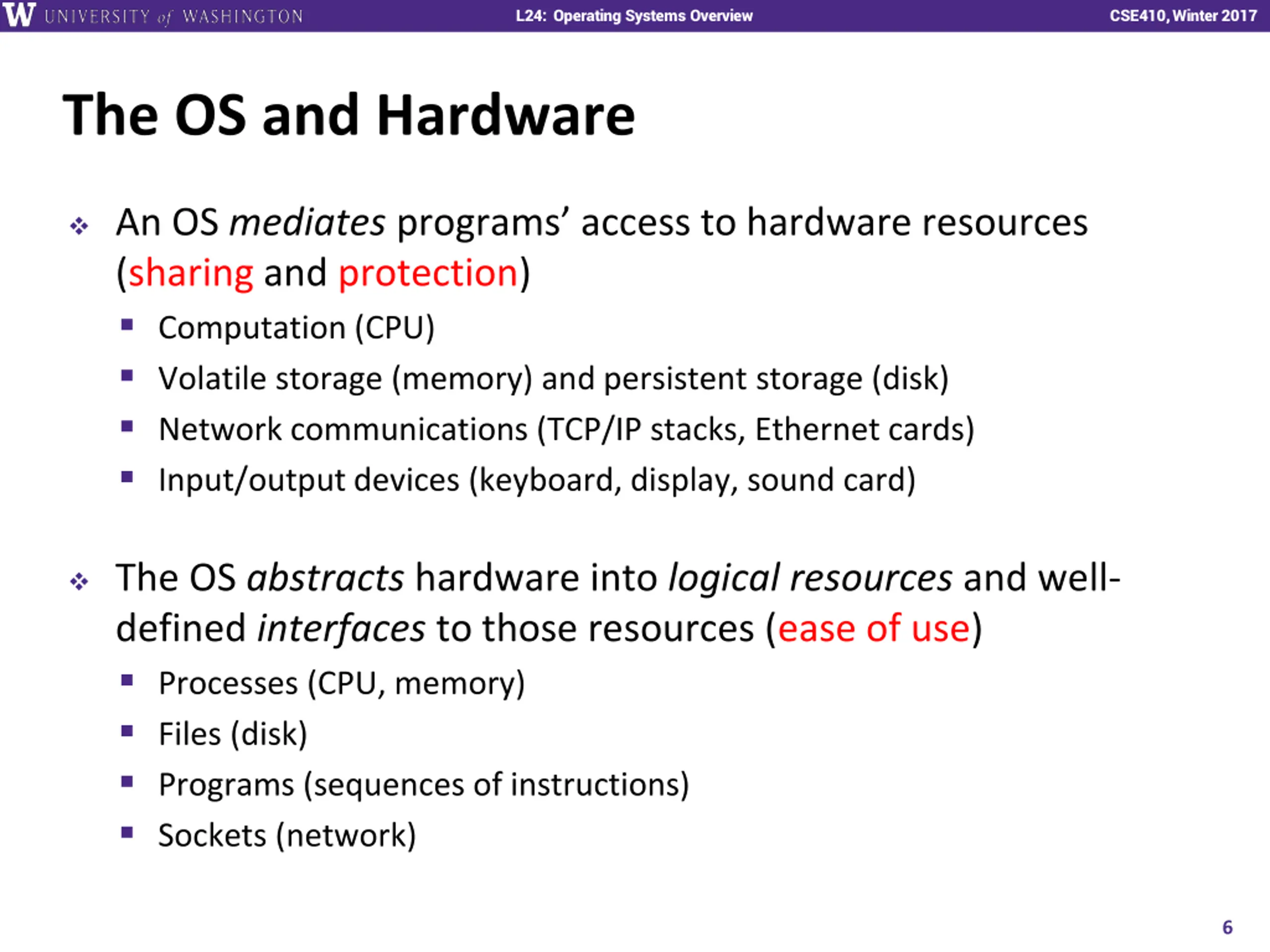 L01: Intro, Combinational Logic L24: Operating Systems Overview CSE369, Autumn 2016 CSE410, Winter 2017 The OS and Hardware An OS mediatesprograms access to hardware resources (sharing and protection) Computation (CPU) Volatile storage (memory) and persistent storage (disk) Network communications (TCP/IP stacks, Ethernet cards) Input/output devices (keyboard, display, sound card) The OS abstracts hardware into logical resources and well- defined interfaces to those resources (ease of use) Processes (CPU, memory) Files (disk) Programs (sequences of instructions) Sockets (network) 6