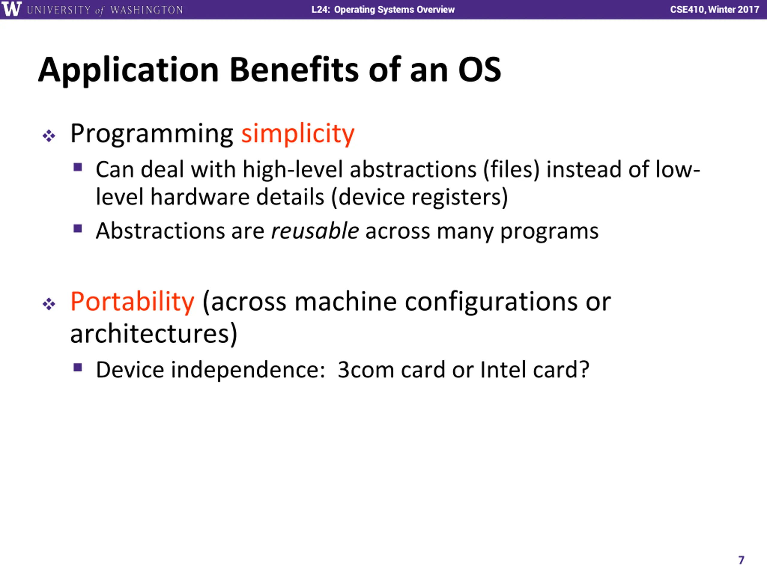 L01: Intro, Combinational Logic L24: Operating Systems Overview CSE369, Autumn 2016 CSE410, Winter 2017 Application Benefits of an OS Programming simplicity Can deal with high-level abstractions (files) instead of low- level hardware details (device registers) Abstractions are reusable across many programs Portability (across machine configurations or architectures) Device independence: 3com card or Intel card? 7