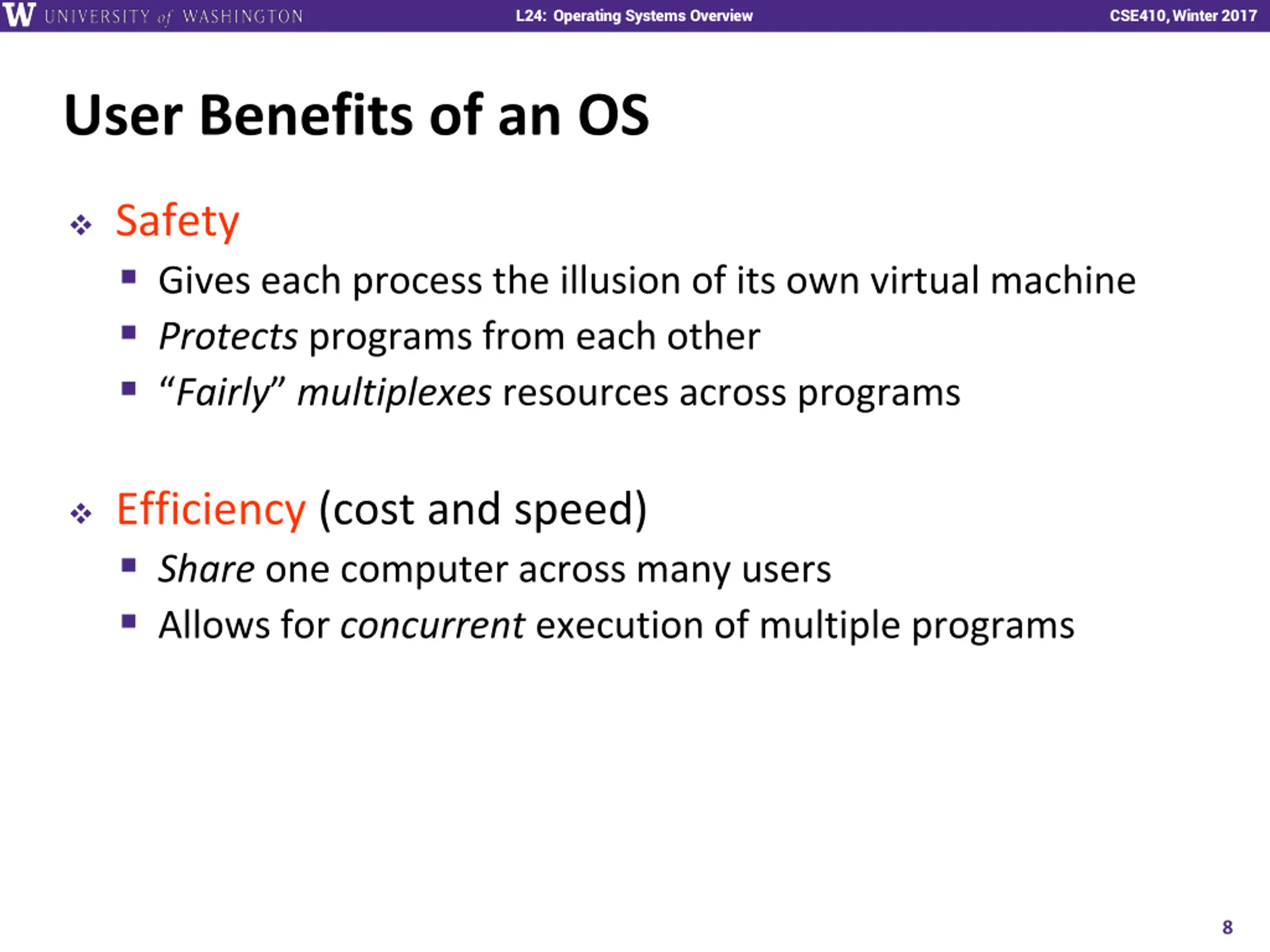 L01: Intro, Combinational Logic L24: Operating Systems Overview CSE369, Autumn 2016 CSE410, Winter 2017 User Benefits of an OS Safety Gives each process the illusion of its own virtual machine Protects programs from each other Fairly multiplexes resources across programs Efficiency (cost and speed) Share one computer across many users Allows for concurrent execution of multiple programs 8