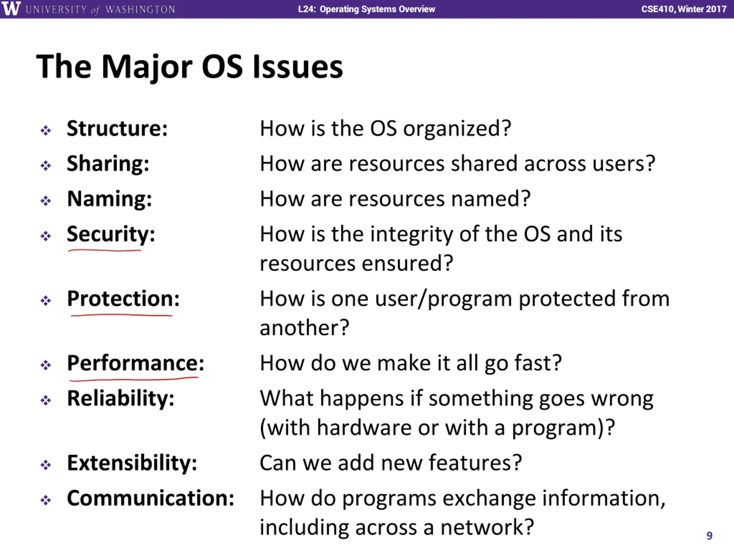 L01: Intro, Combinational Logic L24: Operating Systems Overview CSE369, Autumn 2016 CSE410, Winter 2017 The Major OS Issues Structure: How is the OS organized? How are resources shared across users? How are resources named? How is the integrity of the OS and its resources ensured? How is one user/program protected from another? How do we make it all go fast? What happens if something goes wrong (with hardware or with a program)? Can we add new features? Sharing: Naming: Security: Protection: Performance: Reliability: Extensibility: Communication: How do programs exchange information, including across a network? 9