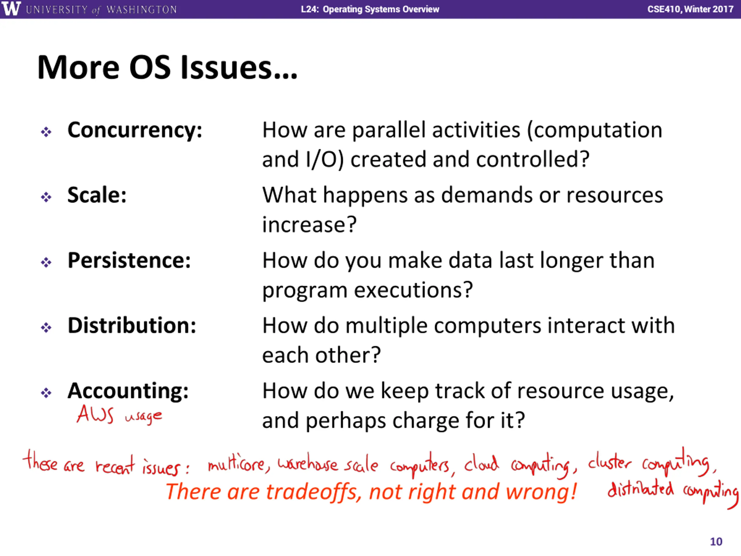 L01: Intro, Combinational Logic L24: Operating Systems Overview CSE369, Autumn 2016 CSE410, Winter 2017 More OS Issues Concurrency: How are parallel activities (computation and I/O) created and controlled? What happens as demands or resources increase? How do you make data last longer than program executions? How do multiple computers interact with each other? How do we keep track of resource usage, and perhaps charge for it? Scale: Persistence: Distribution: Accounting: There are tradeoffs, not right and wrong! 10