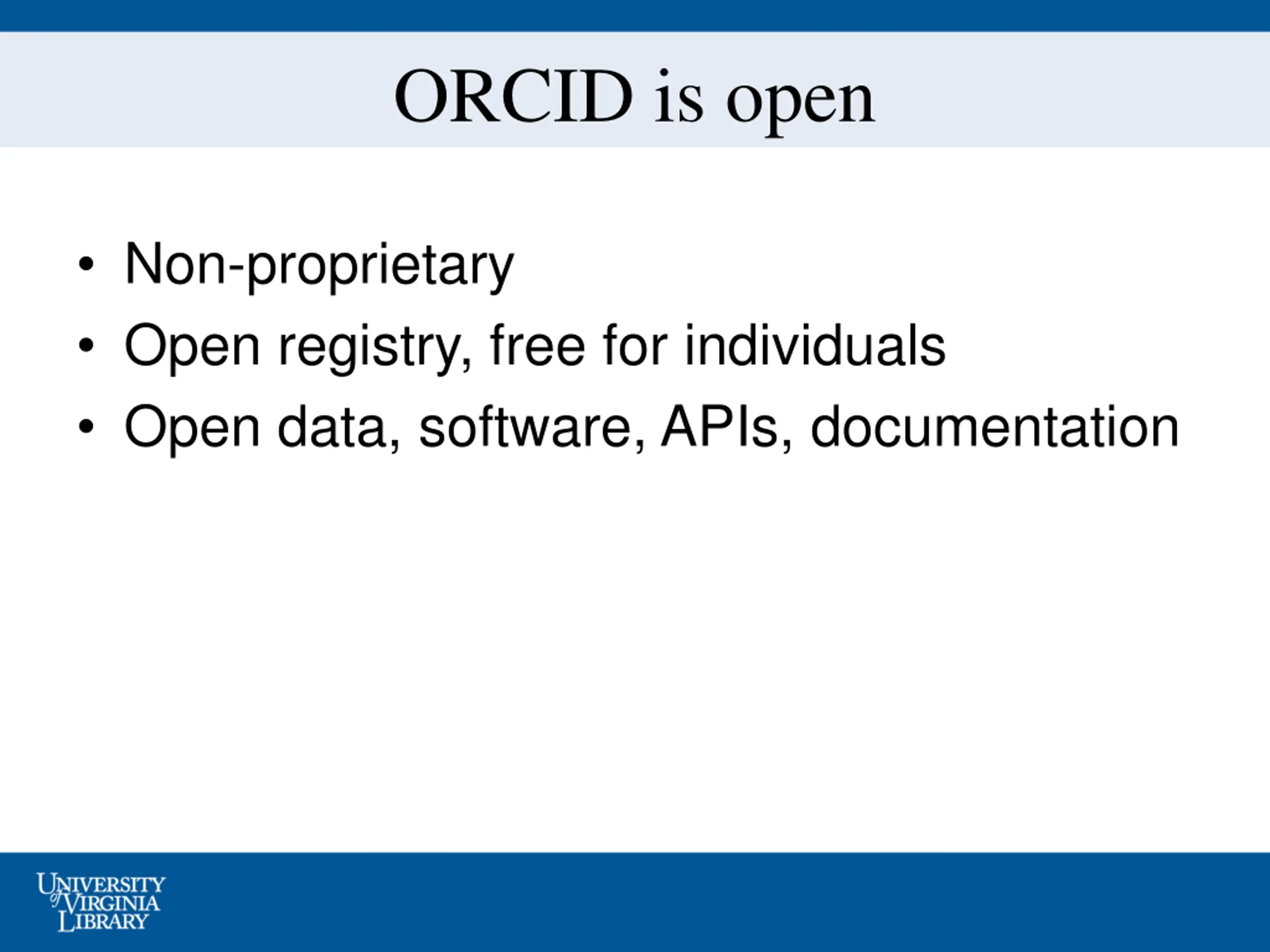 ORCID is open Non-proprietary Open registry, free for individuals Open data, software, APIs, documentation
