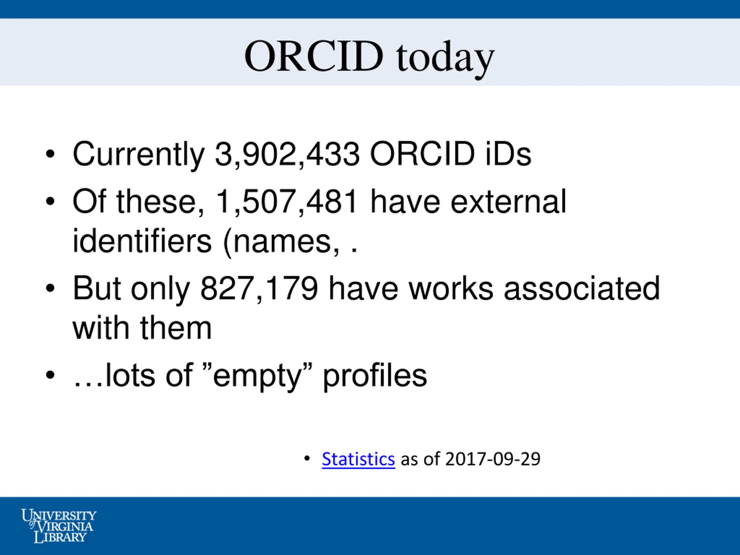 ORCID today Currently 3,902,433 ORCID iDs Of these, 1,507,481 have external identifiers (names, . But only 827,179 have works associated with them lots of empty profiles Statistics as of 2017-09-29