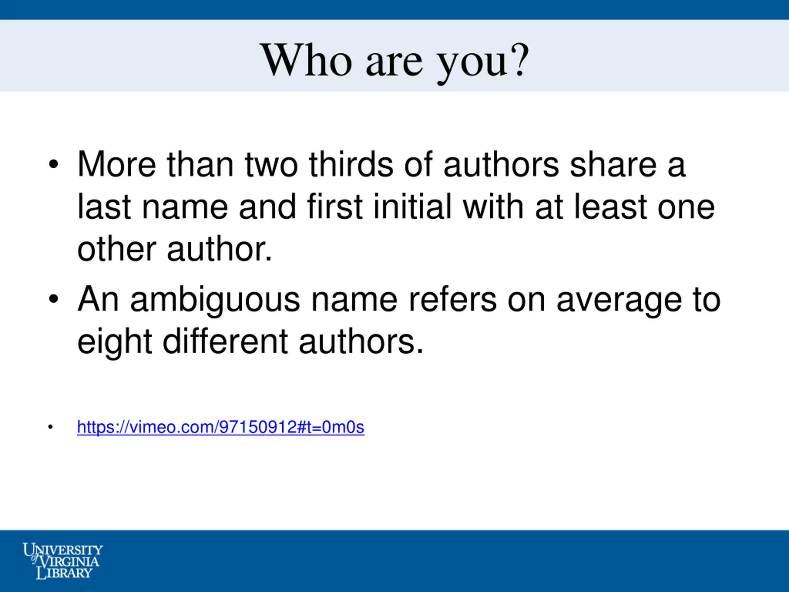 Who are you? More than two thirds of authors share a last name and first initial with at least one other author. An ambiguous name refers on average to eight different authors. https://vimeo.com/97150912#t=0m0s