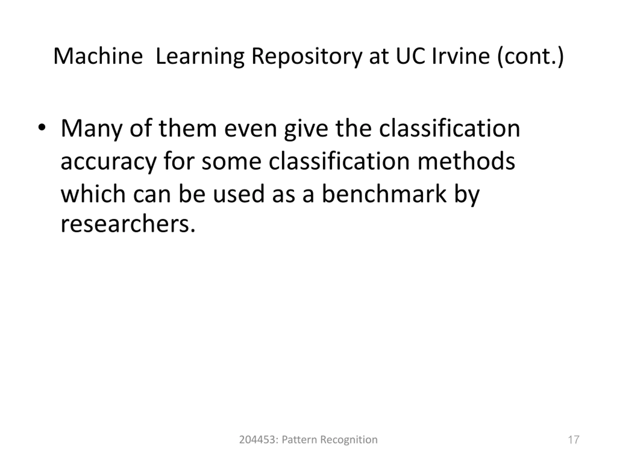 Machine Learning Repository at UC Irvine www.ics.uci.edu/MLRepository.html It contains a number of data sets of varying sizes which can be used by any classification algorithms. 16 204453: Pattern Recognition