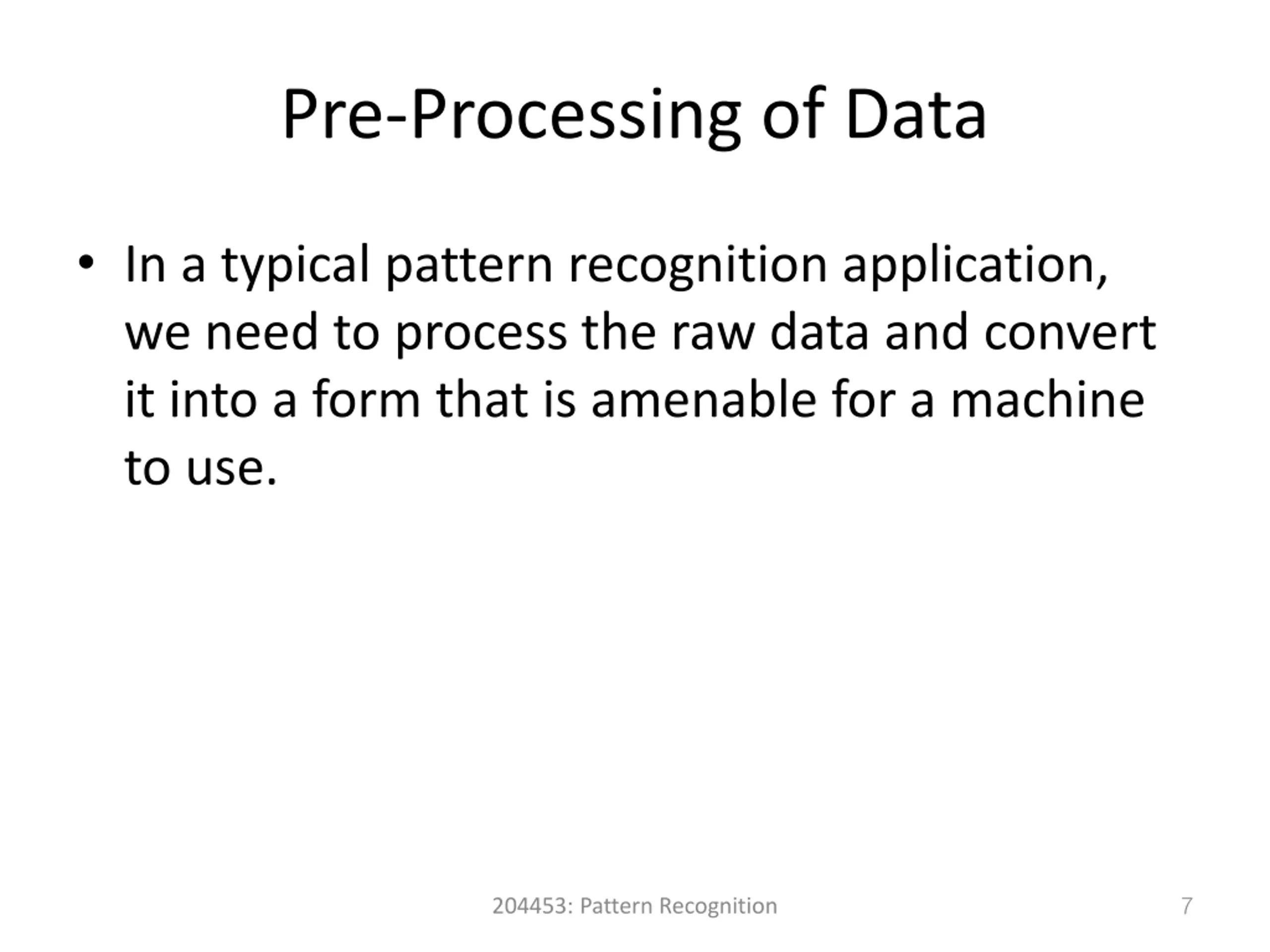 Pre-Processing of Data In a typical pattern recognition application, we need to process the raw data and convert it into a form that is amenable for a machine to use. 7 204453: Pattern Recognition