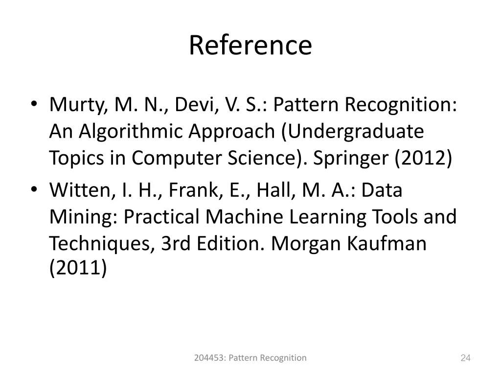 Reference Murty, M. N., Devi, V. S.: Pattern Recognition: An Algorithmic Approach (Undergraduate Topics in Computer Science). Springer (2012) Witten, I. H., Frank, E., Hall, M. A.: Data Mining: Practical Machine Learning Tools and Techniques, 3rd Edition. Morgan Kaufman (2011) 24 204453: Pattern Recognition