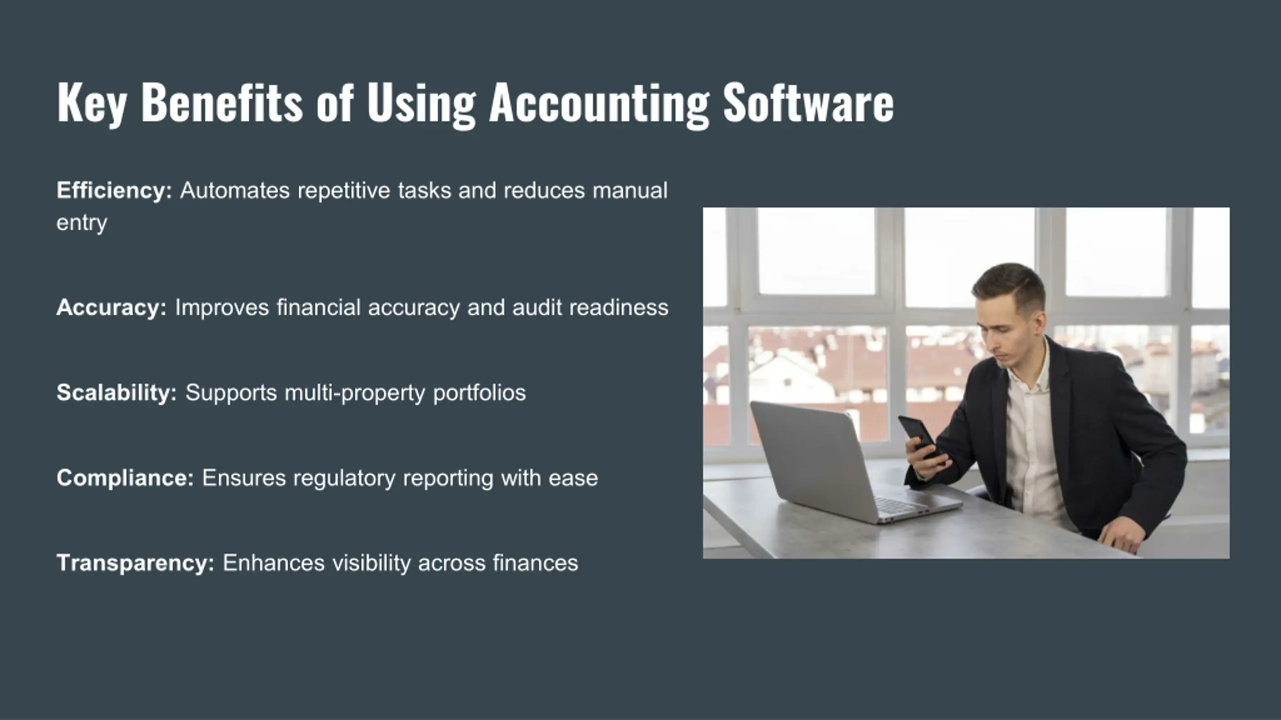 Key Benefits of Using Accounting Software Efficiency: Automates repetitive tasks and reduces manual entry Accuracy: Improves financial accuracy and audit readiness Scalability: Supports multi-property portfolios Compliance: Ensures regulatory reporting with ease Transparency: Enhances visibility across finances