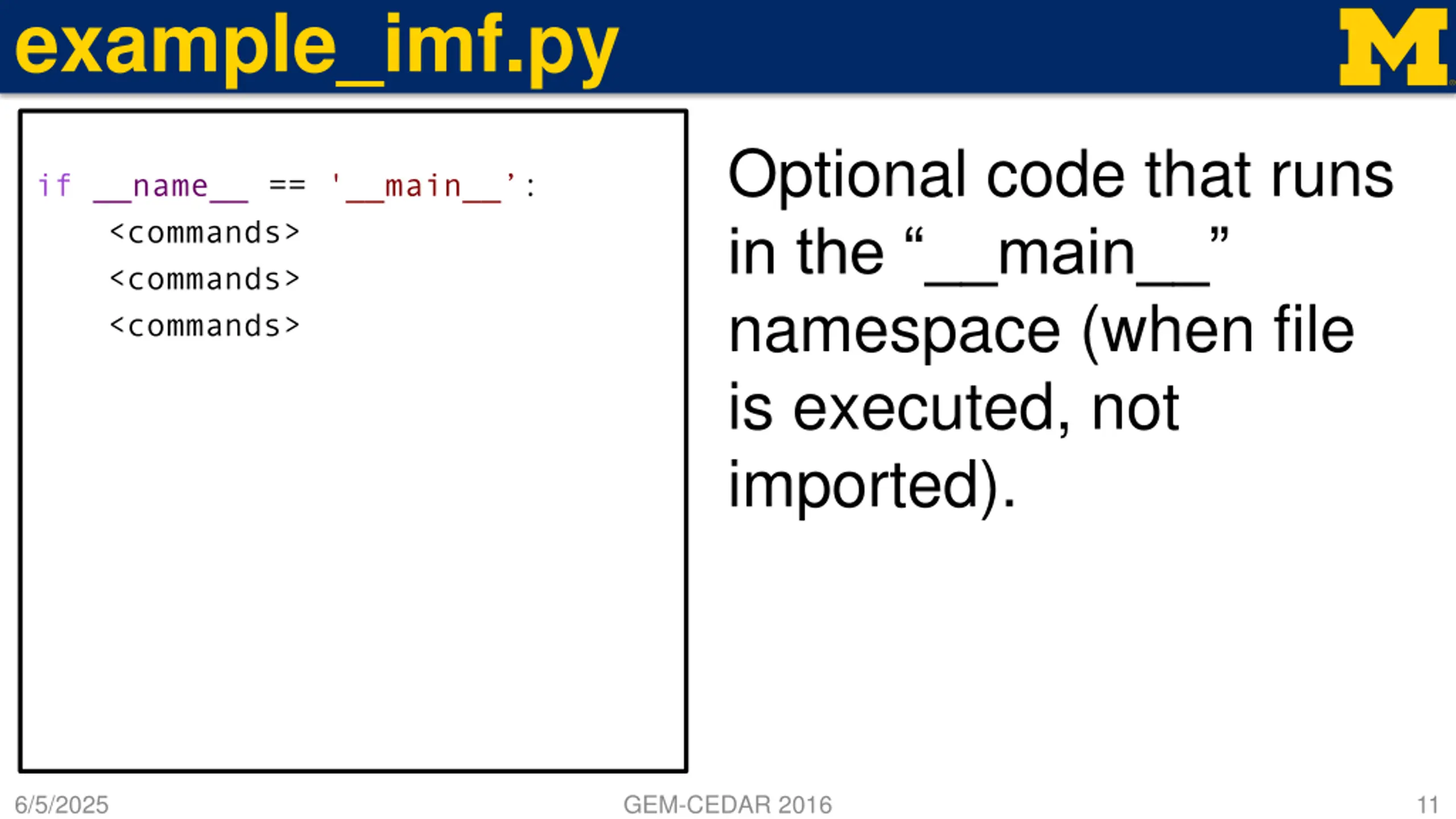 example_imf.py Optional code that runs in the __main__ namespace (when file is executed, not imported). if __name__ == '__main__ : <commands> <commands> <commands> 6/5/2025 11 GEM-CEDAR 2016