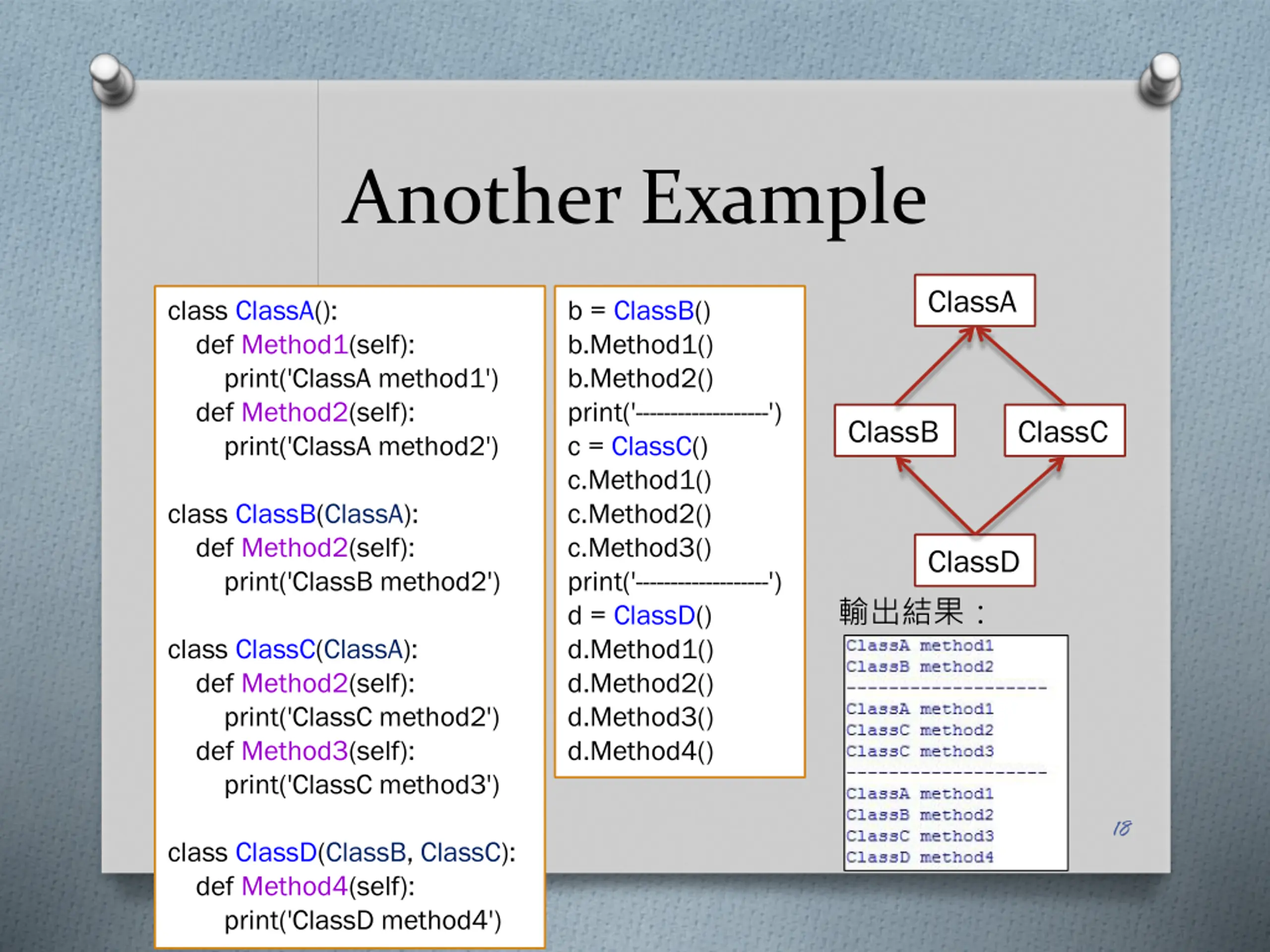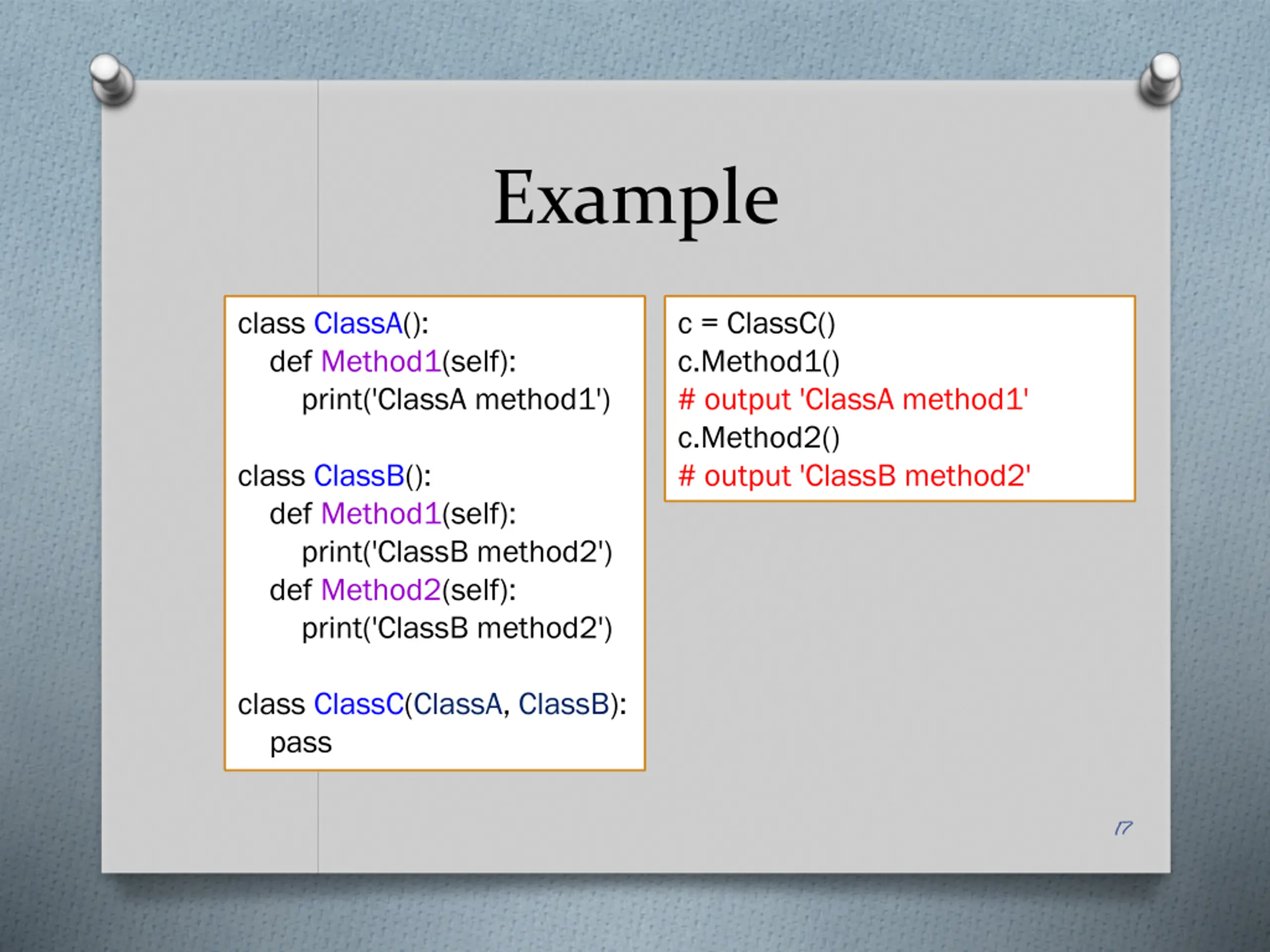 Example class ClassA(): def Method1(self): print('ClassA method1') c = ClassC() c.Method1() # output 'ClassA method1' c.Method2() # output 'ClassB method2' class ClassB(): def Method1(self): print('ClassB method2') def Method2(self): print('ClassB method2') class ClassC(ClassA, ClassB): pass 17