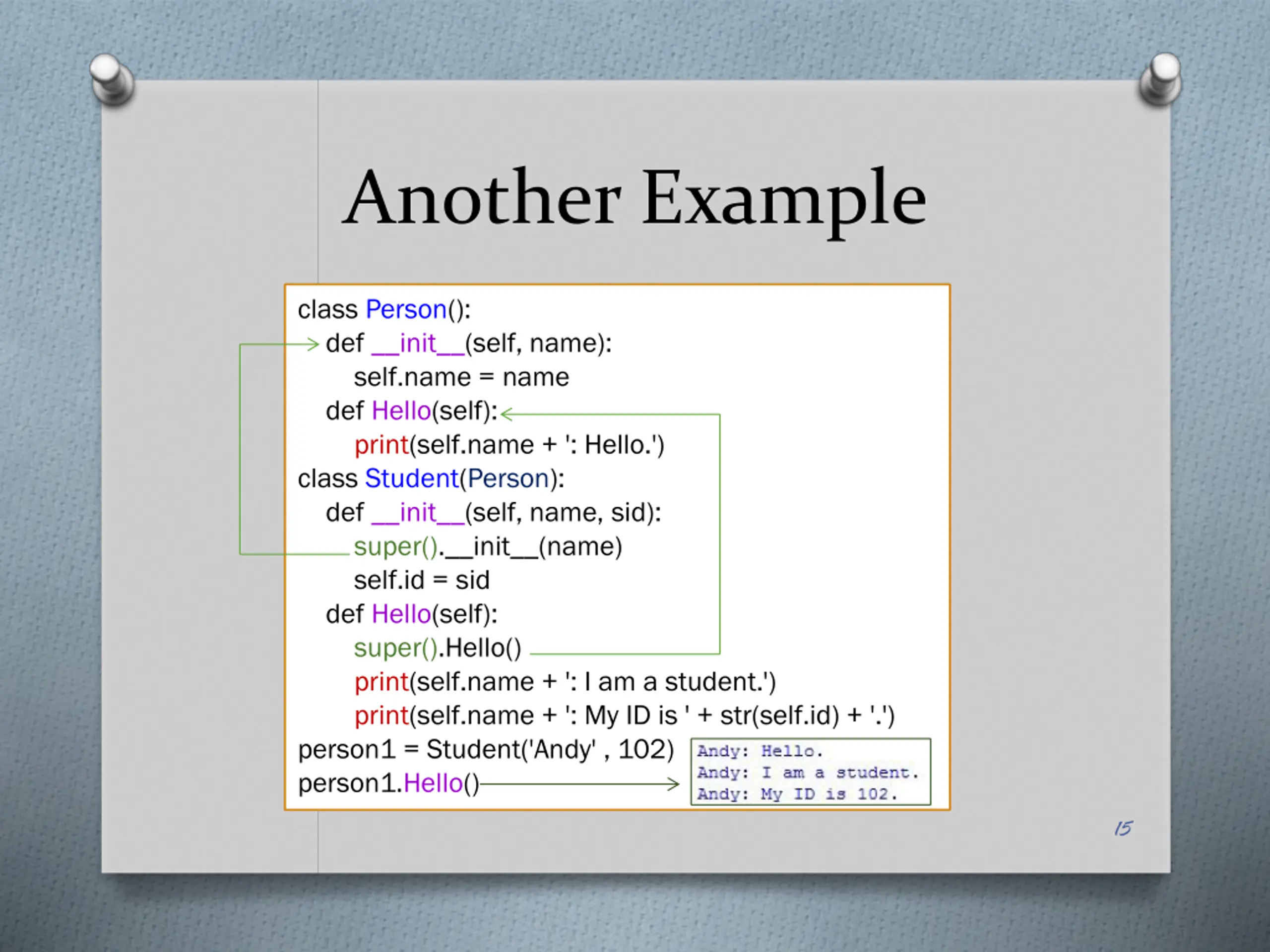 Another Example class Person(): def __init__(self, name): self.name = name def Hello(self): print(self.name + ': Hello.') class Student(Person): def __init__(self, name, sid): super().__init__(name) self.id = sid def Hello(self): super().Hello() print(self.name + ': I am a student.') print(self.name + ': My ID is ' + str(self.id) + '.') person1 = Student('Andy' , 102) person1.Hello() 15