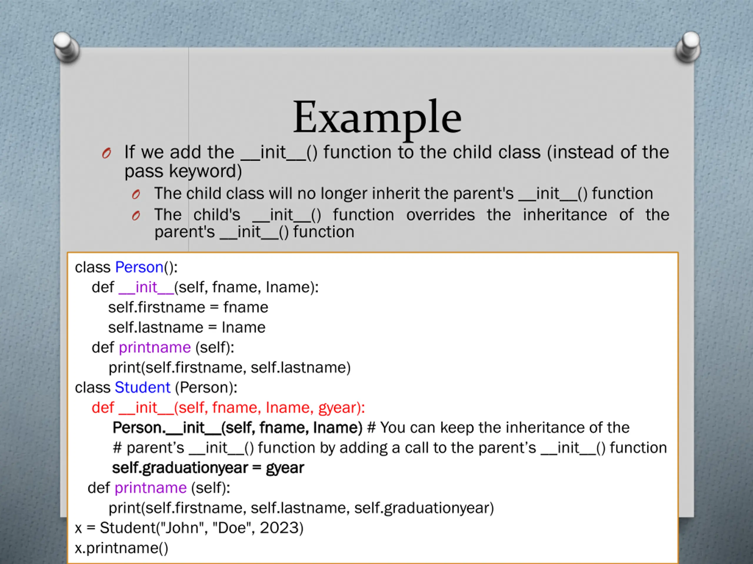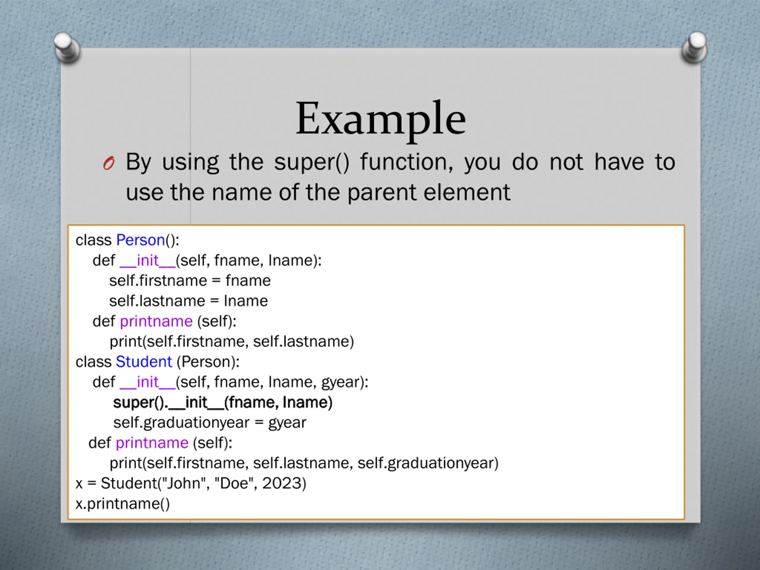 Example O By using the super() function, you do not have to use the name of the parent element class Person(): def __init__(self, fname, lname): self.firstname = fname self.lastname = lname def printname (self): print(self.firstname, self.lastname) class Student (Person): def __init__(self, fname, lname, gyear): super().__ super().__init init__( __(fname self.graduationyear = gyear def printname (self): print(self.firstname, self.lastname, self.graduationyear) x = Student("John", "Doe", 2023) x.printname() fname, , lname lname) ) 14