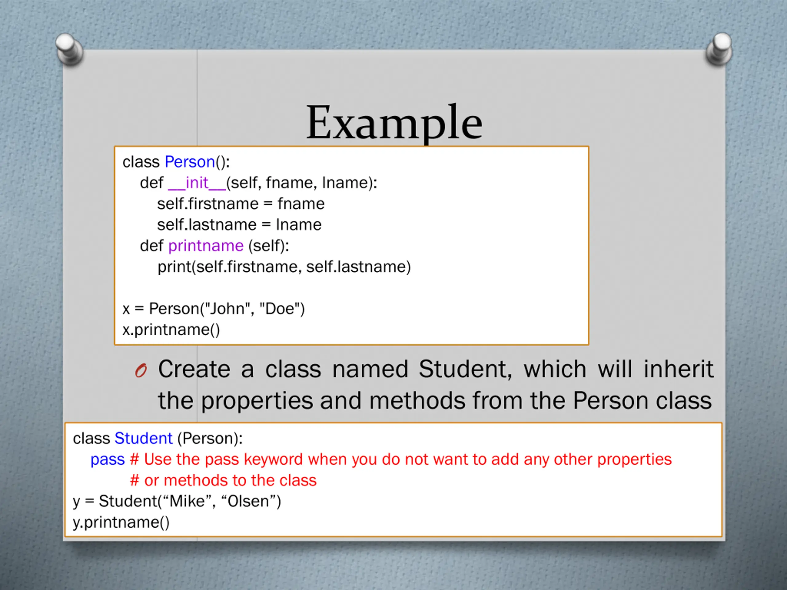 Example class Person(): def __init__(self, fname, lname): self.firstname = fname self.lastname = lname def printname (self): print(self.firstname, self.lastname) x = Person("John", "Doe") x.printname() O Create a class named Student, which will inherit the properties and methods from the Person class class Student (Person): pass # Use the pass keyword when you do not want to add any other properties # or methods to the class y = Student( Mike , Olsen ) y.printname() 12