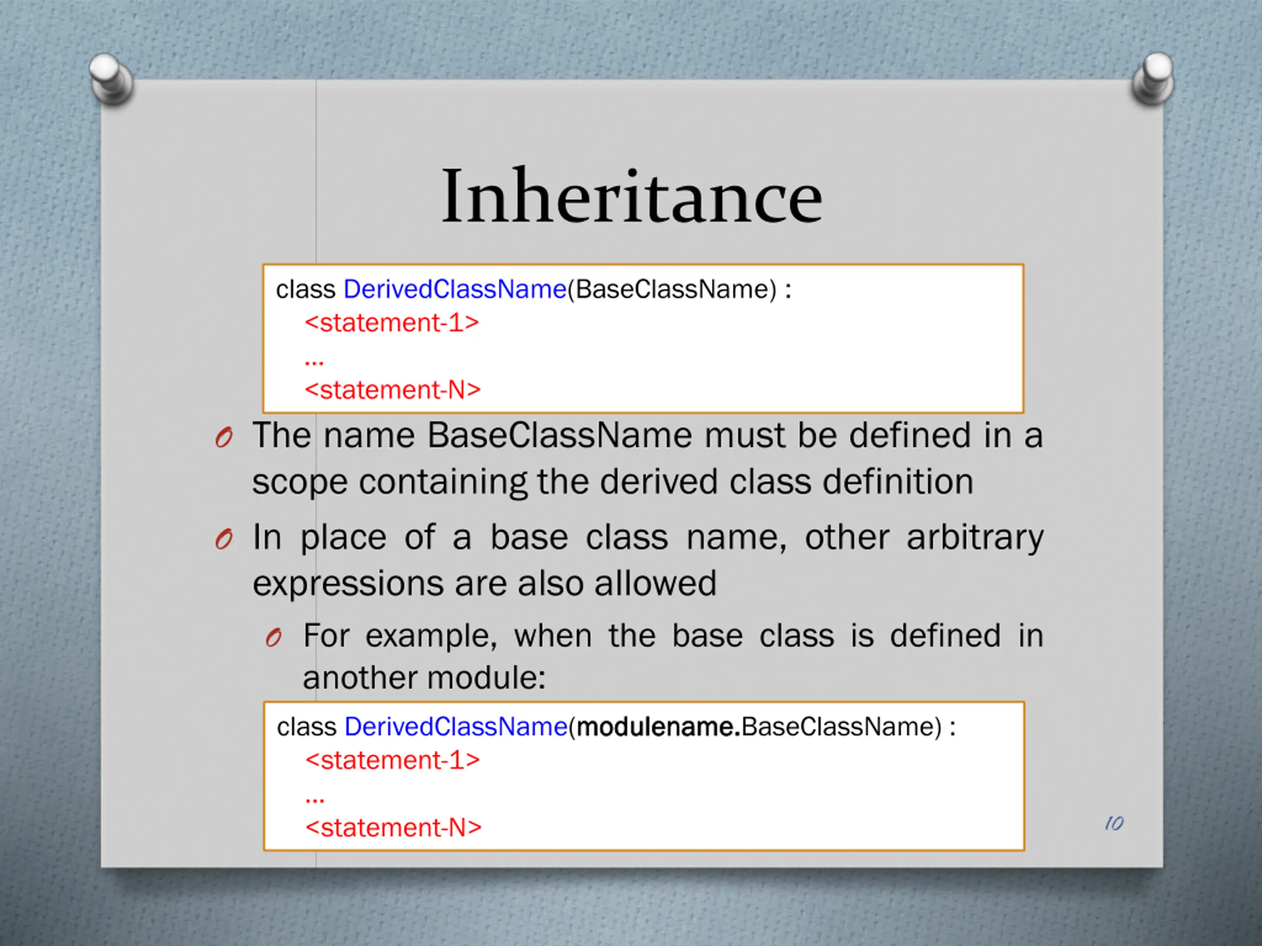 Inheritance class DerivedClassName(BaseClassName) : <statement-1> <statement-N> O The name BaseClassName must be defined in a scope containing the derived class definition O In place of a base class name, other arbitrary expressions are also allowed O For example, when the base class is defined in another module: class DerivedClassName(modulename. modulename.BaseClassName) : <statement-1> <statement-N> 10