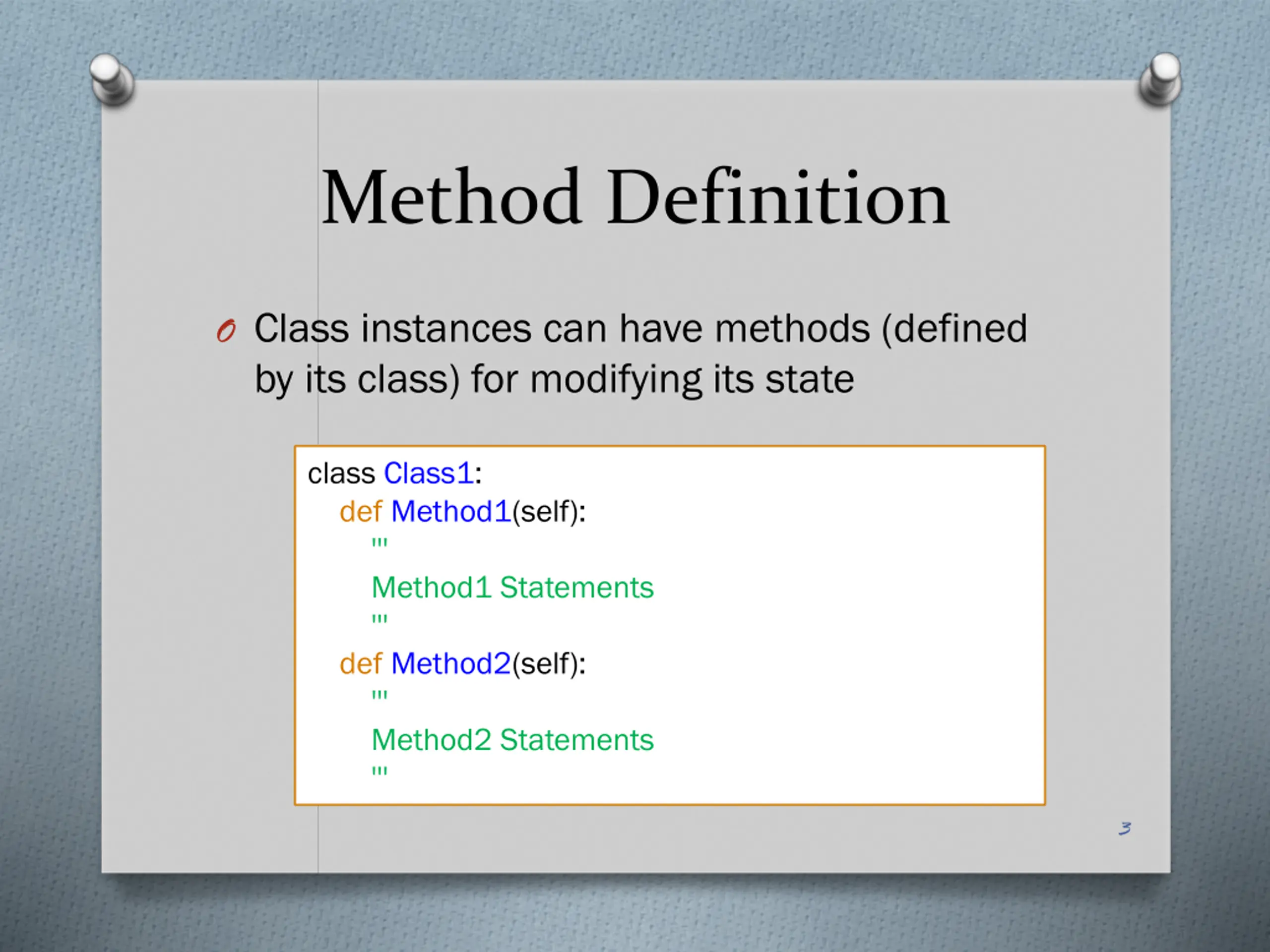 Method Definition O Class instances can have methods (defined by its class) for modifying its state class Class1: def Method1(self): ''' Method1 Statements ''' def Method2(self): ''' Method2 Statements ''' 3
