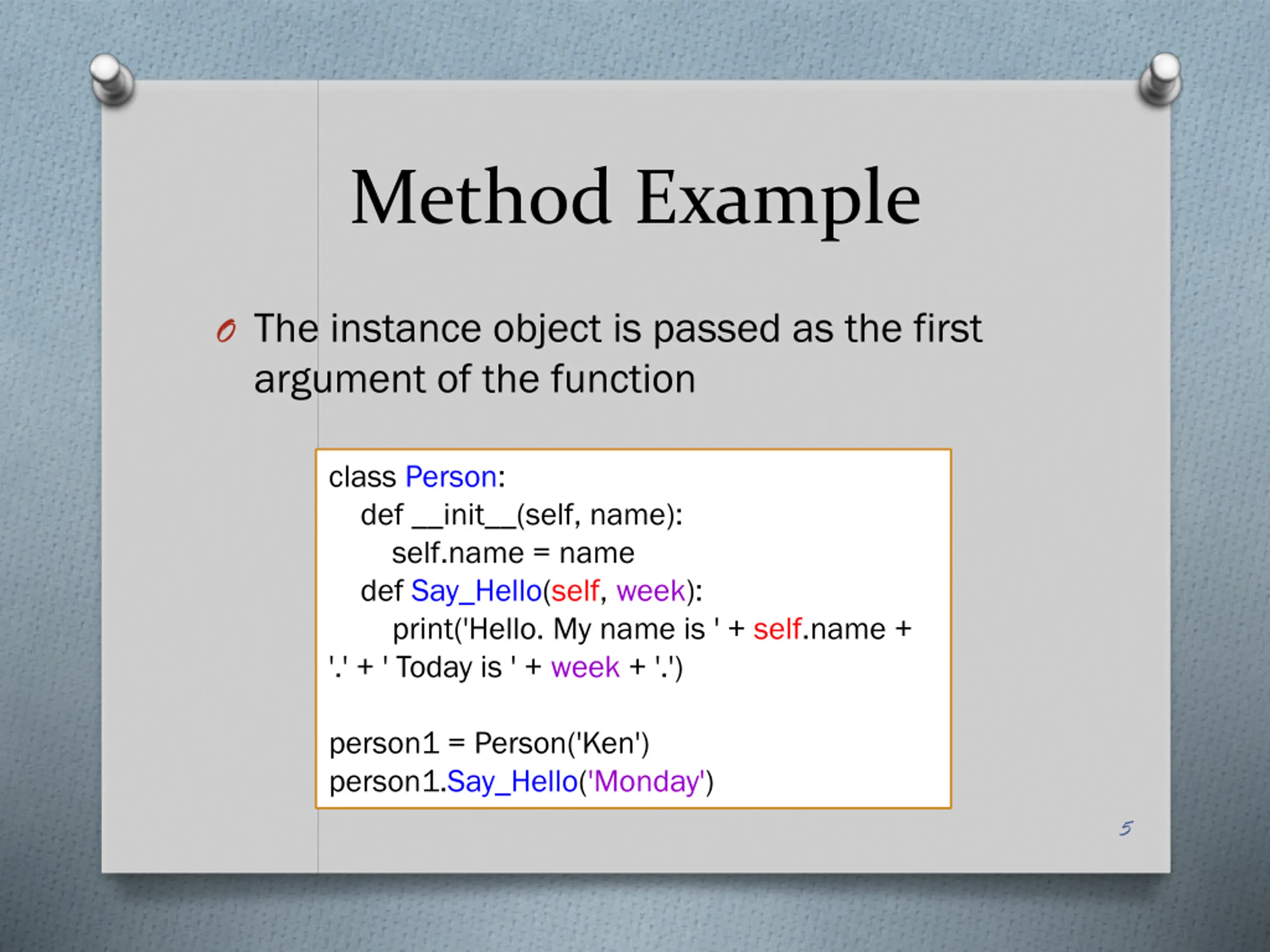 Method Example O The instance object is passed as the first argument of the function class Person: def __init__(self, name): self.name = name def Say_Hello(self, week): print('Hello. My name is ' + self.name + '.' + ' Today is ' + week + '.') person1 = Person('Ken') person1.Say_Hello('Monday') 5