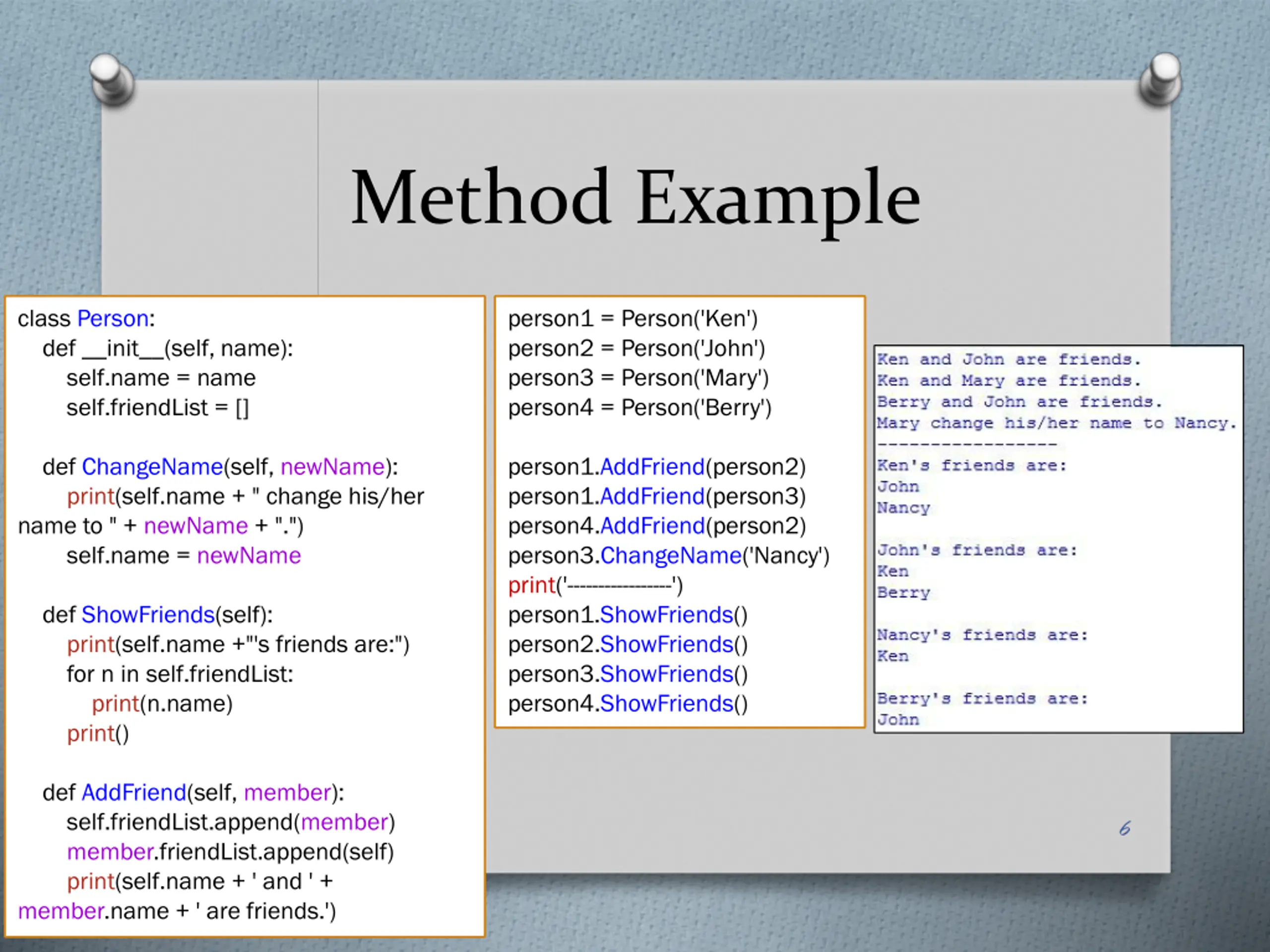 Method Example class Person: def __init__(self, name): self.name = name self.friendList = [] person1 = Person('Ken') person2 = Person('John') person3 = Person('Mary') person4 = Person('Berry') def ChangeName(self, newName): print(self.name + " change his/her name to " + newName + ".") self.name = newName person1.AddFriend(person2) person1.AddFriend(person3) person4.AddFriend(person2) person3.ChangeName('Nancy') print('-----------------') person1.ShowFriends() person2.ShowFriends() person3.ShowFriends() person4.ShowFriends() def ShowFriends(self): print(self.name +"'s friends are:") for n in self.friendList: print(n.name) print() def AddFriend(self, member): self.friendList.append(member) member.friendList.append(self) print(self.name + ' and ' + member.name + ' are friends.') 6