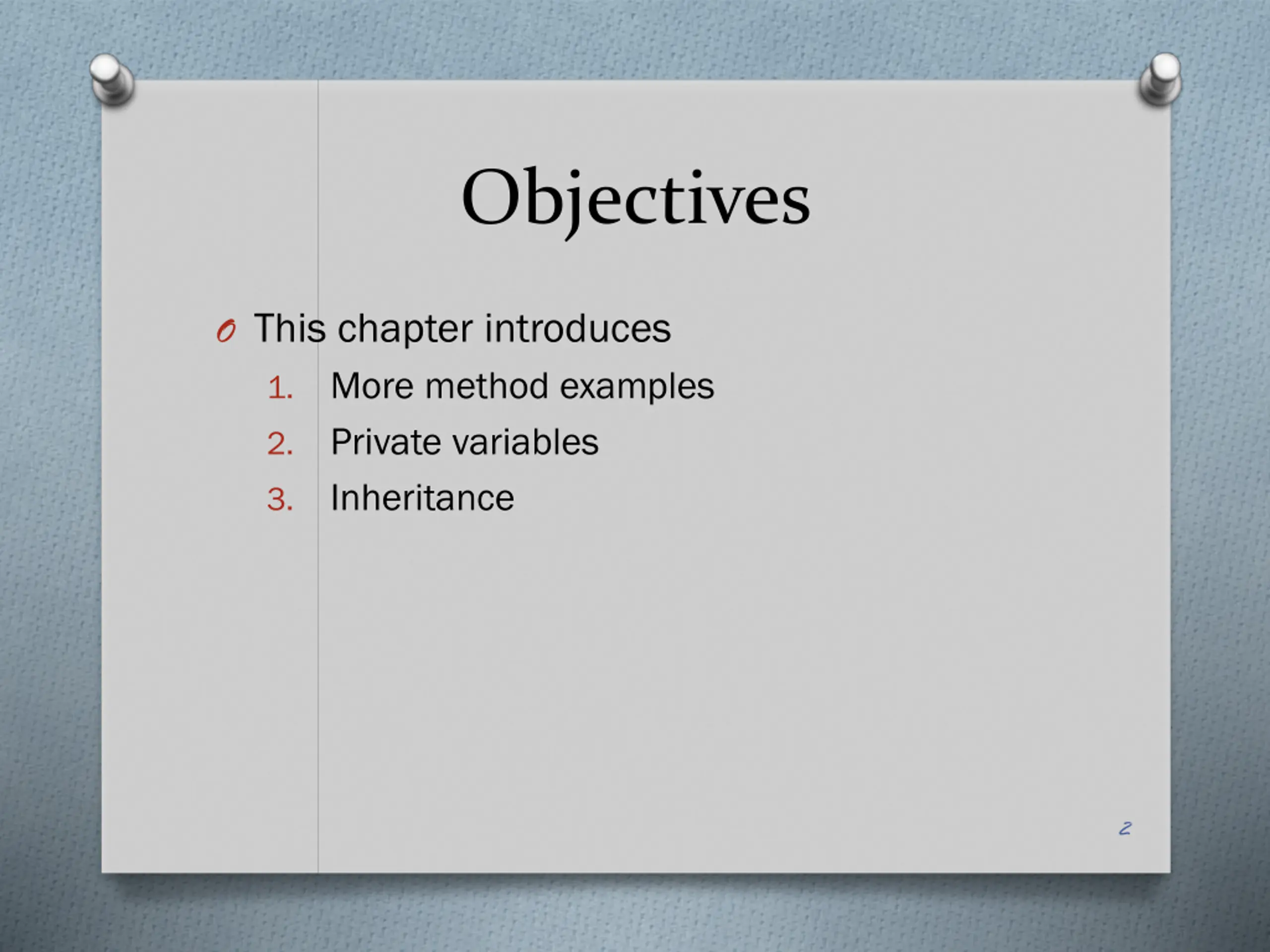 Objectives O This chapter introduces 1. More method examples Private variables Inheritance 2. 3. 2