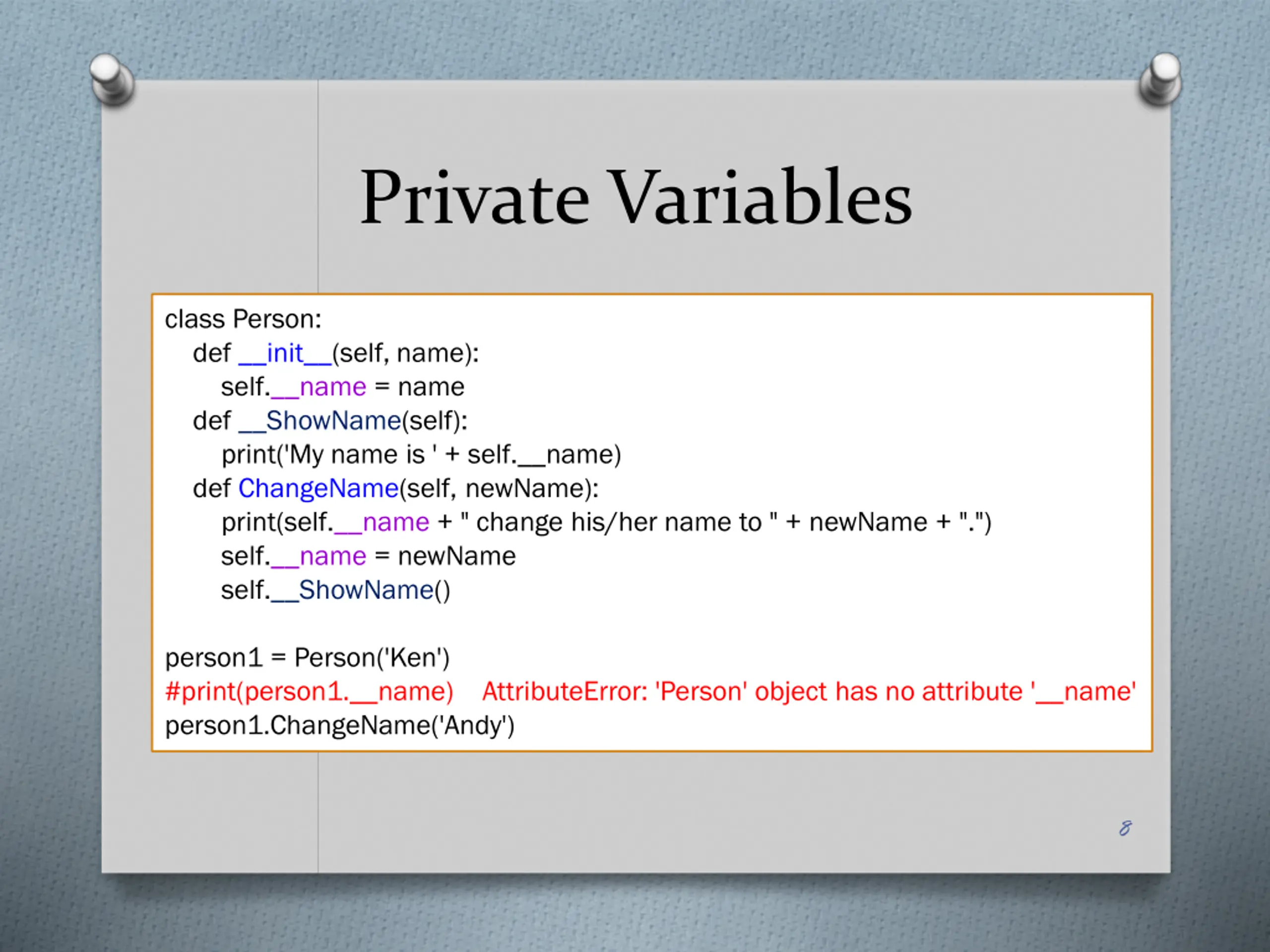 Private Variables class Person: def __init__(self, name): self.__name = name def __ShowName(self): print('My name is ' + self.__name) def ChangeName(self, newName): print(self.__name + " change his/her name to " + newName + ".") self.__name = newName self.__ShowName() person1 = Person('Ken') #print(person1.__name) AttributeError: 'Person' object has no attribute '__name' person1.ChangeName('Andy') 8