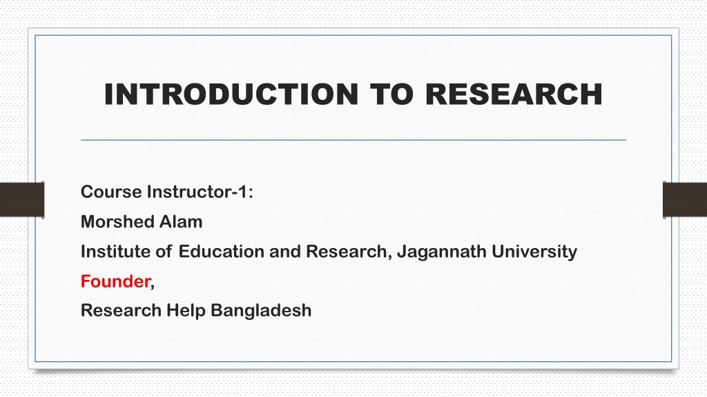 INTRODUCTION TO RESEARCH Course Instructor-1: Morshed Alam Institute of Education and Research, Jagannath University Founder, Research Help Bangladesh