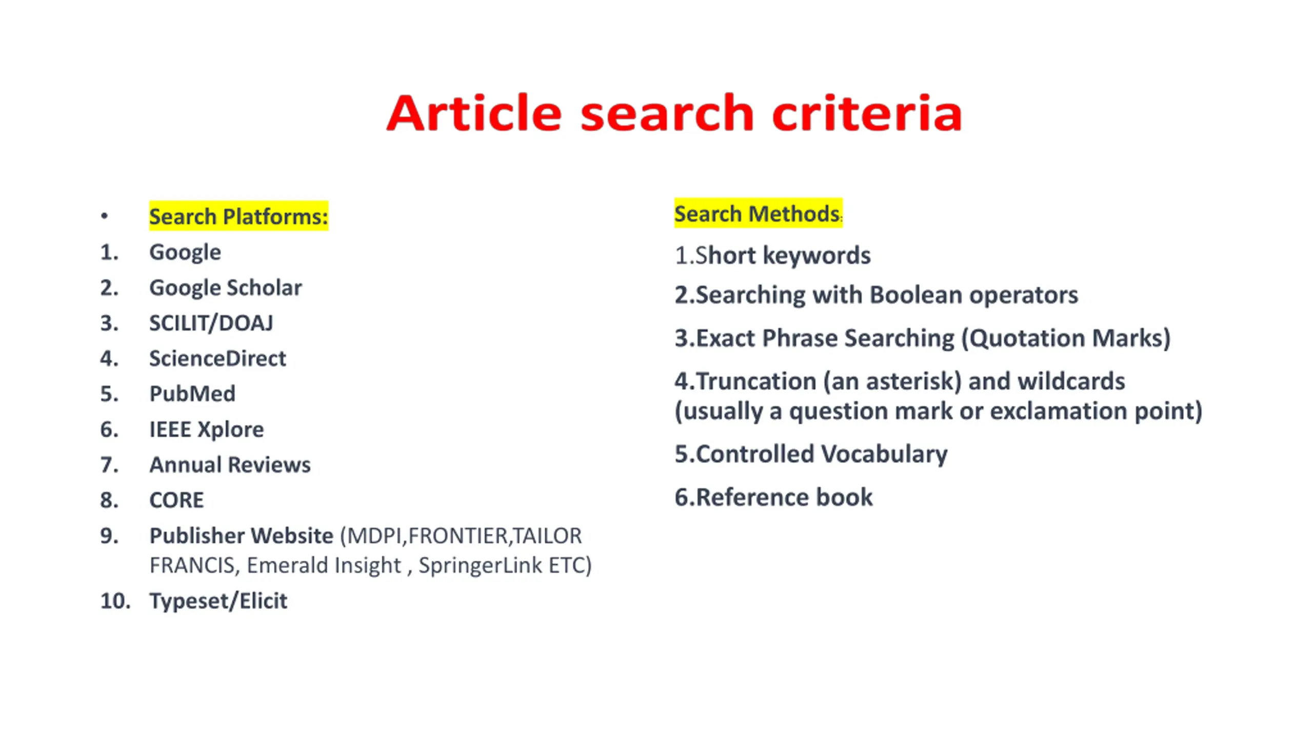 1. 2. 3. 4. 5. 6. 7. 8. 9. Search Methods: Search Platforms: Google Google Scholar SCILIT/DOAJ ScienceDirect PubMed IEEE Xplore Annual Reviews CORE Publisher Website (MDPI,FRONTIER,TAILOR FRANCIS, Emerald Insight , SpringerLink ETC) 10. Typeset/Elicit 1.Short keywords 2.Searching with Boolean operators 3.Exact Phrase Searching (Quotation Marks) 4.Truncation (an asterisk) and wildcards (usually a question mark or exclamation point) 5.Controlled Vocabulary 6.Reference book