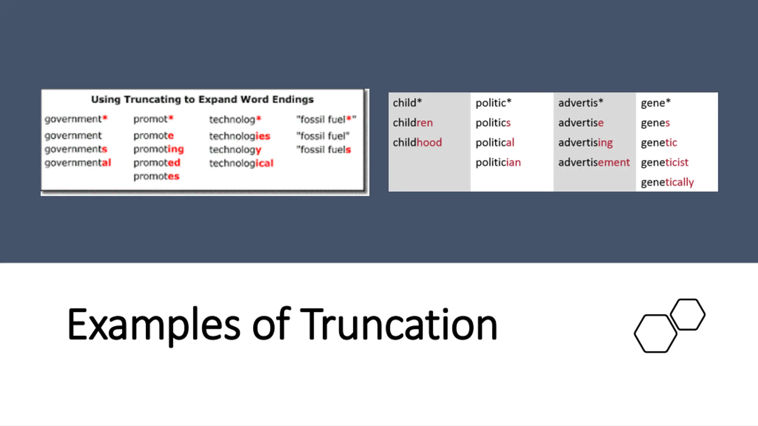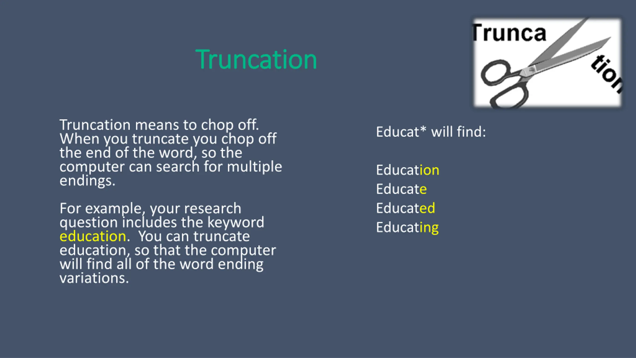 Truncation Truncation Truncation means to chop off. When you truncate you chop off the end of the word, so the computer can search for multiple endings. Educat* will find: Education Educate Educated Educating For example, your research question includes the keyword education. You can truncate education, so that the computer will find all of the word ending variations.