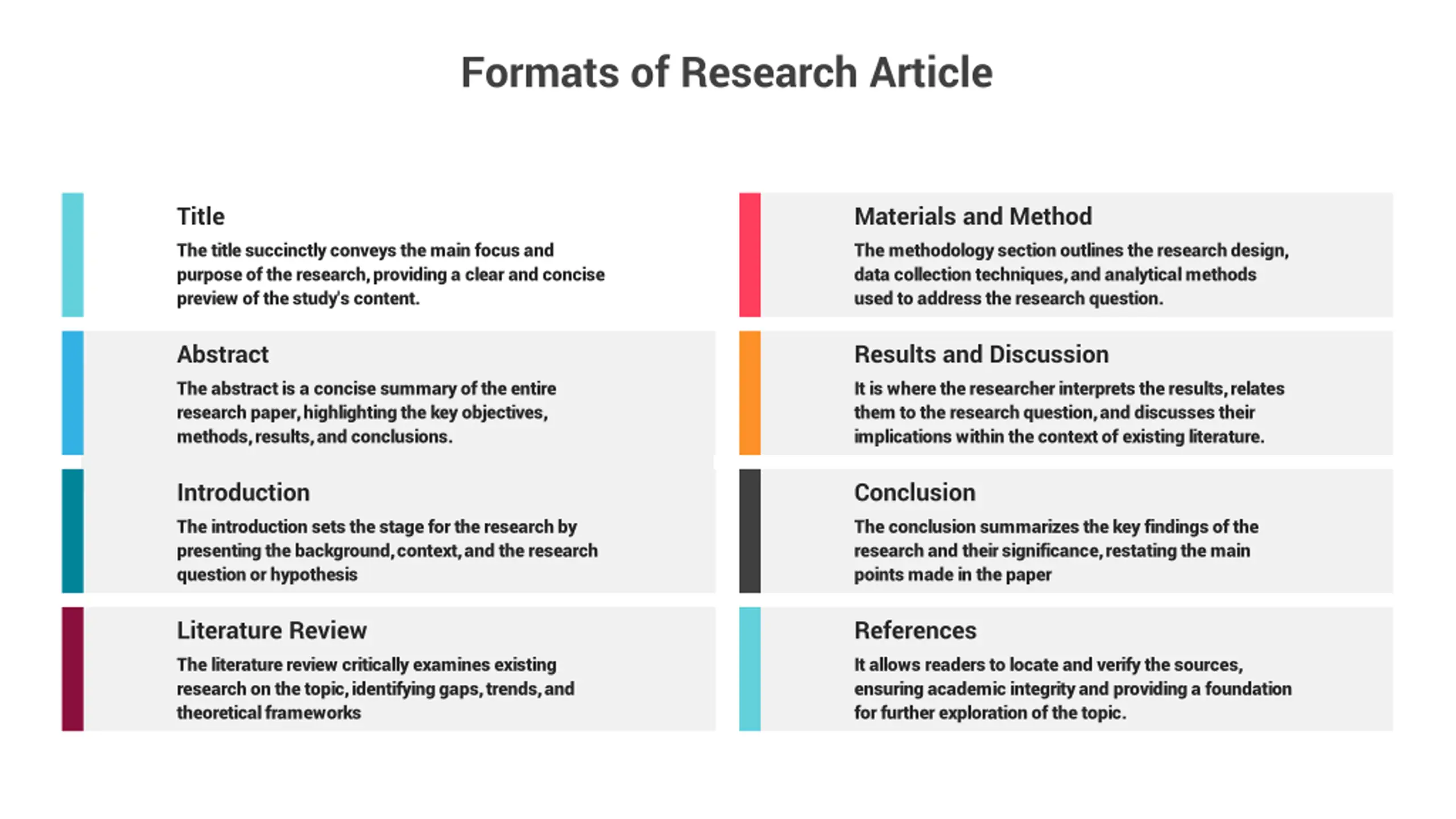 Formats of Research Article Title The title succinctly conveys the main focus and purpose of the research, providing a clear and concise preview of the study's content. Materials and Method The methodology section outlines the research design, data collection techniques, and analytical methods used to address the research question. Abstract The abstract is a concise summary of the entire research paper, highlighting the key objectives, methods, results, and conclusions. Results and Discussion It is where the researcher interprets the results, relates them to the research question, and discusses their implications within the context of existing literature. Introduction The introduction sets the stage for the research by presenting the background, context, and the research question or hypothesis Conclusion The conclusion summarizes the key findings of the research and their significance, restating the main points made in the paper Literature Review The literature review critically examines existing research on the topic, identifying gaps, trends, and theoretical frameworks References It allows readers to locate and verify the sources, ensuring academic integrity and providing a foundation for further exploration of the topic.