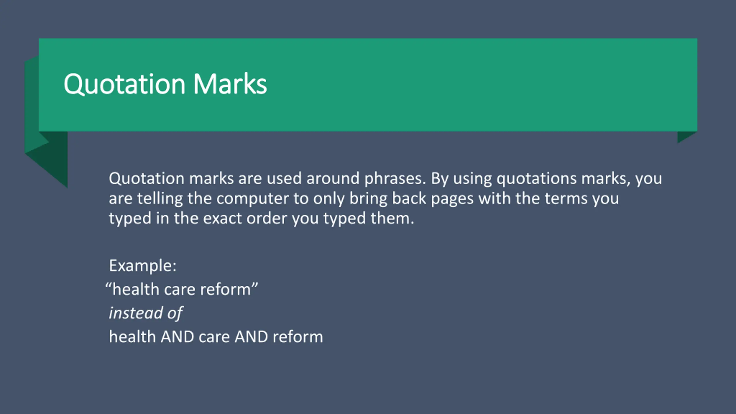 Quotation Marks Quotation Marks Quotation marks are used around phrases. By using quotations marks, you are telling the computer to only bring back pages with the terms you typed in the exact order you typed them. Example: health care reform instead of health AND care AND reform