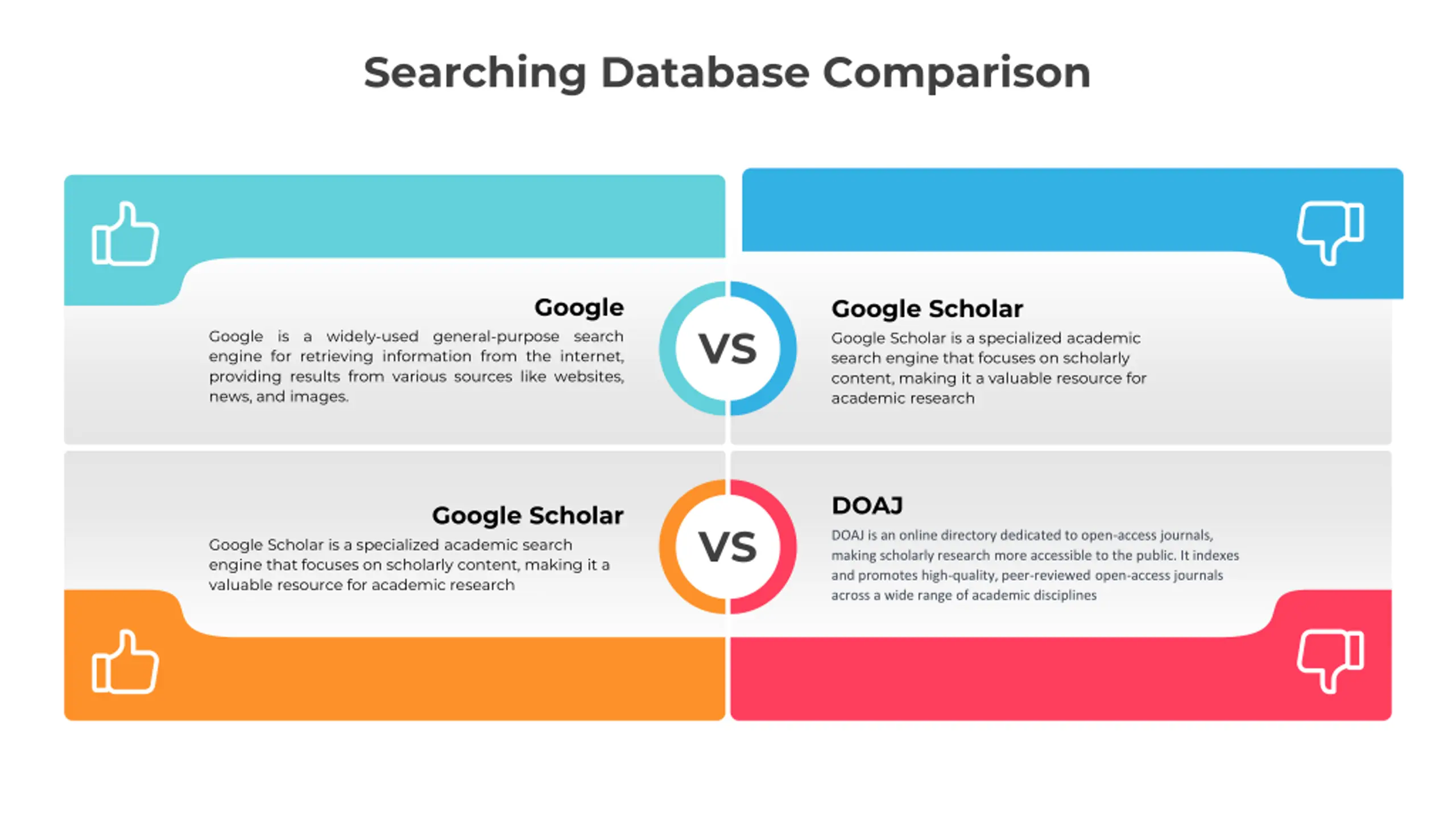 Searching Database Comparison Google Google Scholar Google Scholar is a specialized academic search engine that focuses on scholarly content, making it a valuable resource for academic research VS Google is a widely-used general-purpose search engine for retrieving information from the internet, providing results from various sources like websites, news, and images. DOAJ Google Scholar VS DOAJ is an online directory dedicated to open-access journals, making scholarly research more accessible to the public. It indexes and promotes high-quality, peer-reviewed open-access journals across a wide range of academic disciplines Google Scholar is a specialized academic search engine that focuses on scholarly content, making it a valuable resource for academic research