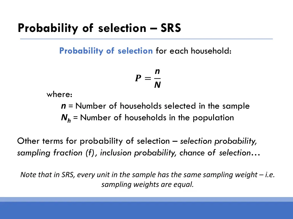Probability of selection SRS Probability of selection for each household: ? =n N where: n = Number of households selected in the sample Nh = Number of households in the population Other terms for probability of selection selection probability, sampling fraction (f), inclusion probability, chance of selection Note that in SRS, every unit in the sample has the same sampling weight i.e. sampling weights are equal.