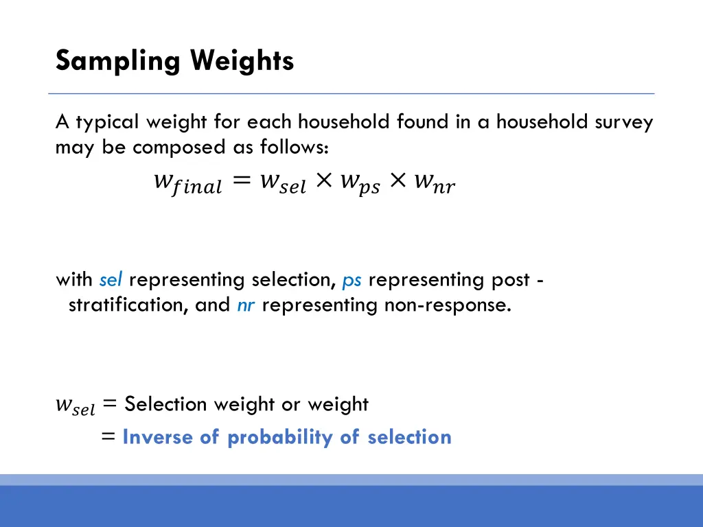 Sampling Weights A typical weight for each household found in a household survey may be composed as follows: ??????= ???? ??? ??? with sel representing selection, ps representing post - stratification, and nr representing non-response. ????= Selection weight or weight = Inverse of probability of selection