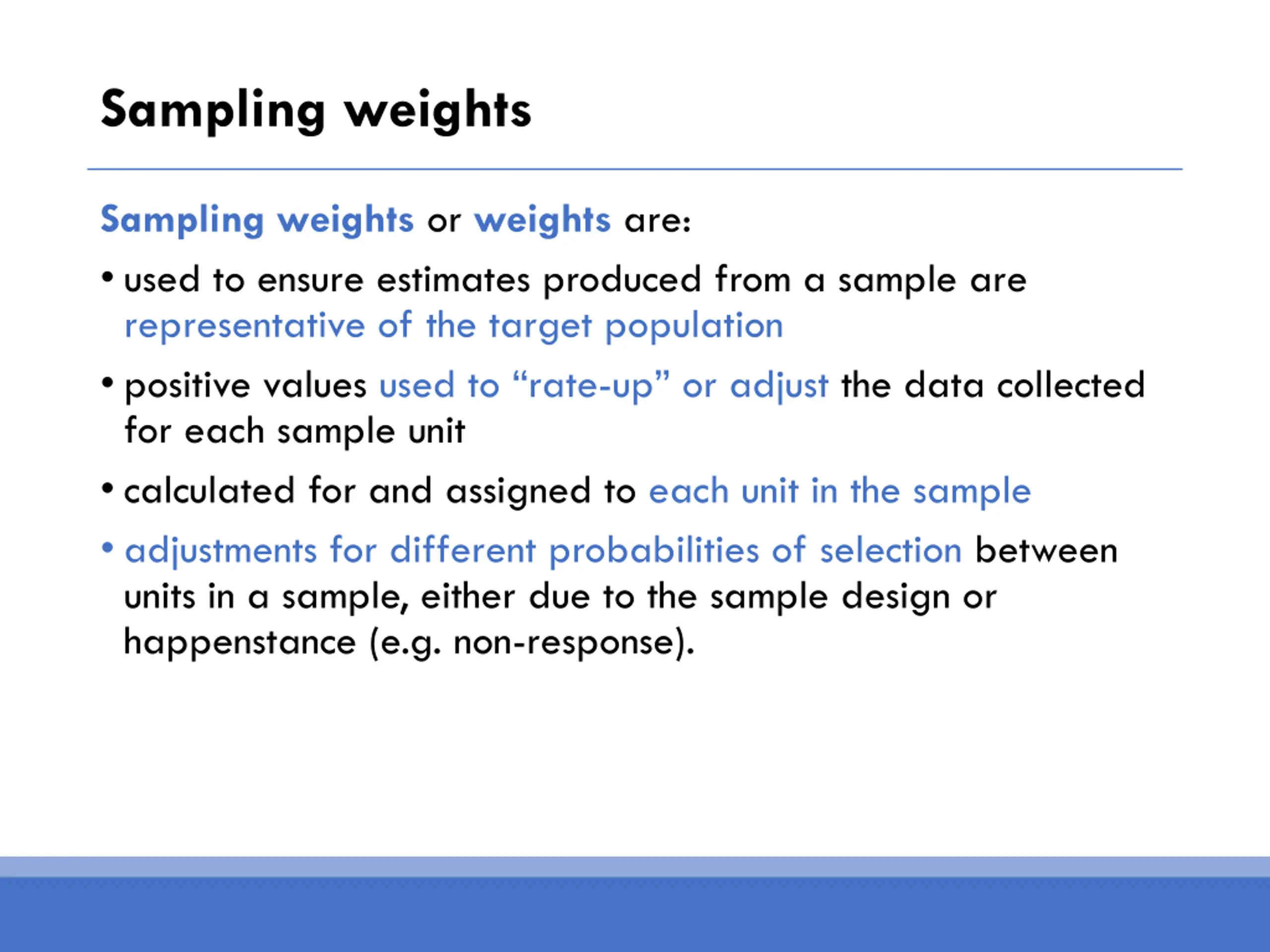 Sampling weights Sampling weights or weights are: used to ensure estimates produced from a sample are representative of the target population positive values used to rate-up or adjust the data collected for each sample unit calculated for and assigned to each unit in the sample adjustments for different probabilities of selection between units in a sample, either due to the sample design or happenstance (e.g. non-response).