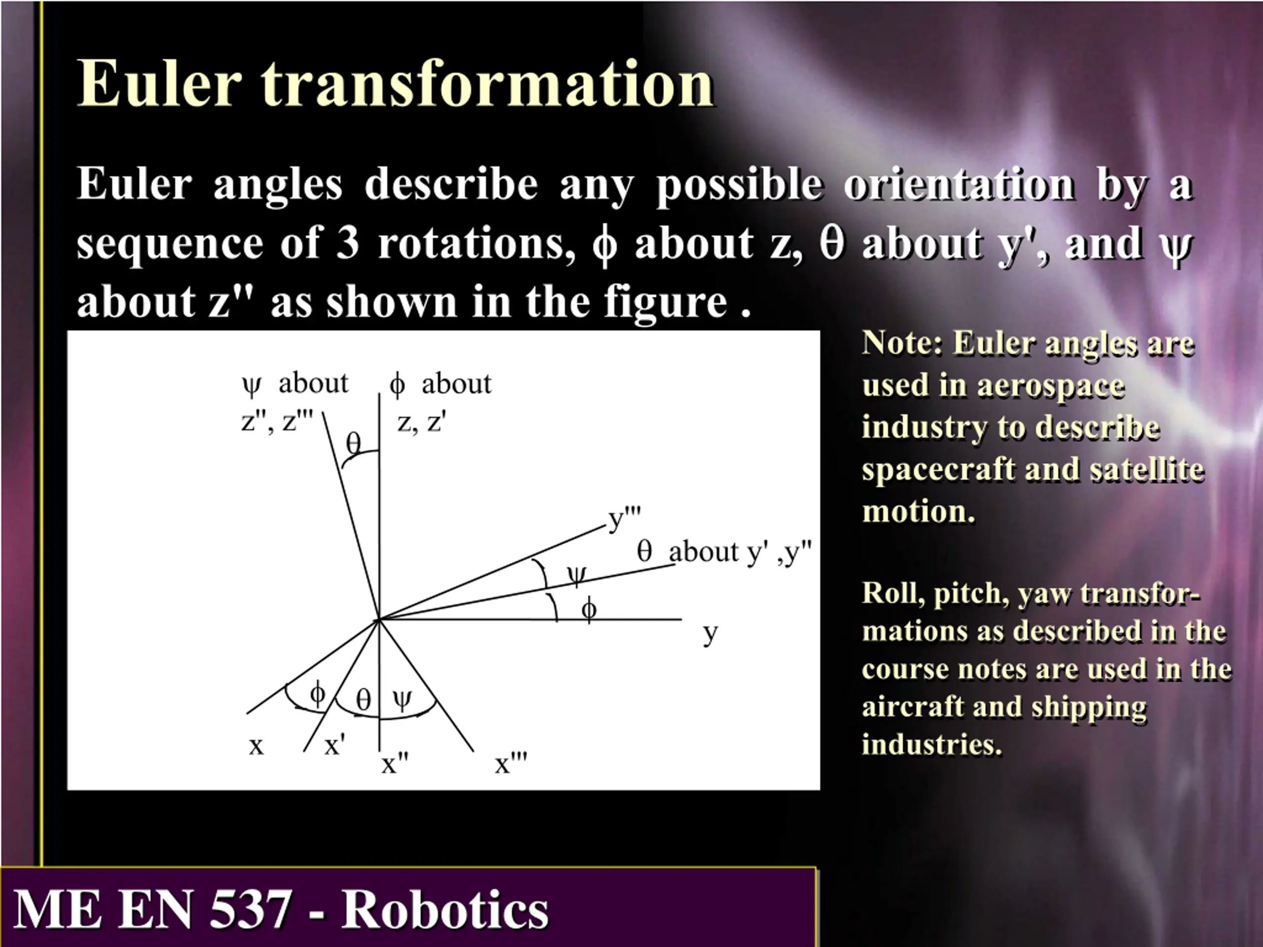 Euler transformation Euler angles describe any possible orientation by a sequence of 3 rotations, about z, about y', and about z" as shown in the figure . Note: Euler angles are used in aerospace industry to describe spacecraft and satellite motion. about z'', z''' about z, z' y''' about y' ,y" Roll, pitch, yaw transfor- mations as described in the course notes are used in the aircraft and shipping industries. y x x' x" x''' ME 537 - Robotics ME EN 537 - Robotics