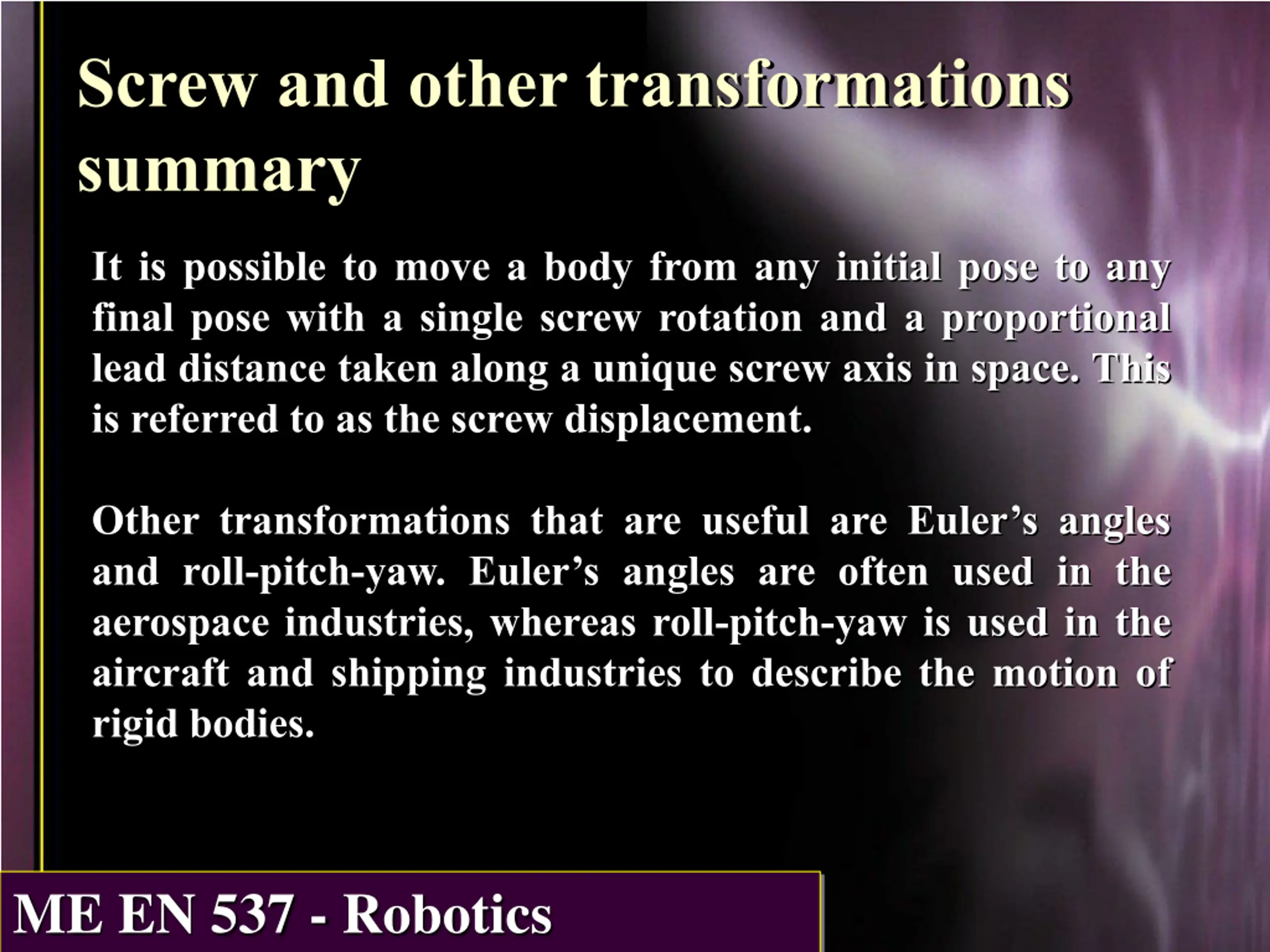 Screw and other transformations summary It is possible to move a body from any initial pose to any final pose with a single screw rotation and a proportional lead distance taken along a unique screw axis in space. This is referred to as the screw displacement. Other transformations that are useful are Euler s angles and roll-pitch-yaw. Euler s angles are often used in the aerospace industries, whereas roll-pitch-yaw is used in the aircraft and shipping industries to describe the motion of rigid bodies. ME 537 - Robotics ME EN 537 - Robotics