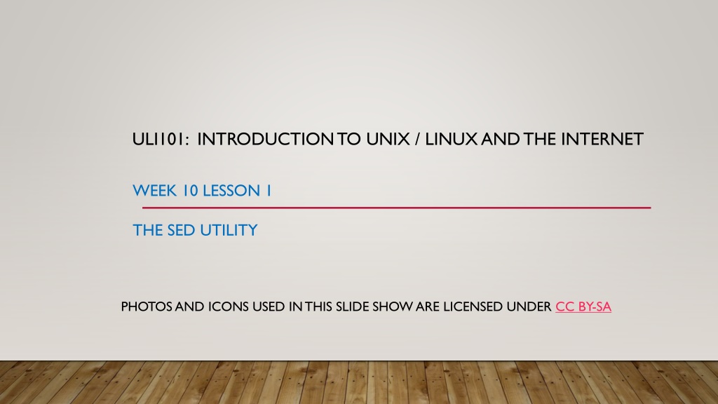 ULI101: INTRODUCTION TO UNIX / LINUX AND THE INTERNET WEEK 10 LESSON 1 THE SED UTILITY PHOTOS AND ICONS USED IN THIS SLIDE SHOW ARE LICENSED UNDER CC BY-SA