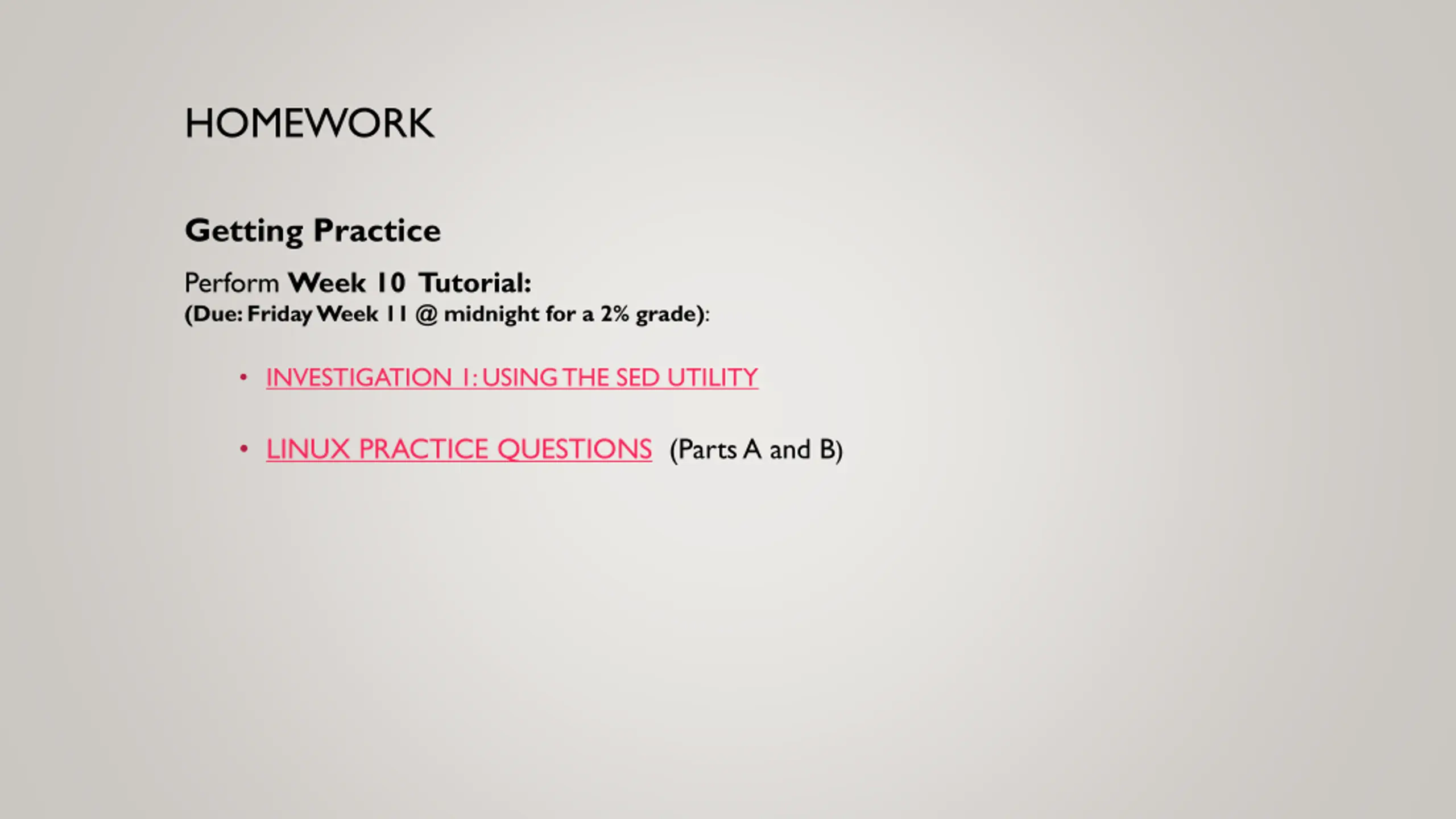 HOMEWORK Getting Practice Perform Week 10 Tutorial: (Due: Friday Week 11 @ midnight for a 2% grade): INVESTIGATION 1: USING THE SED UTILITY LINUX PRACTICE QUESTIONS (Parts A and B)