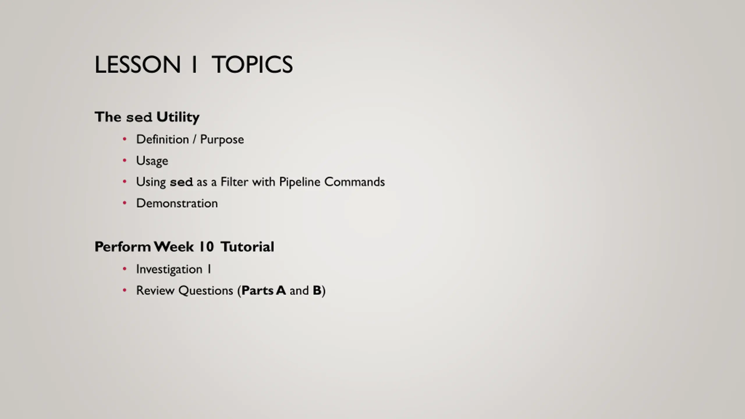 LESSON 1 TOPICS The sed Utility Definition / Purpose Usage Using sed as a Filter with Pipeline Commands Demonstration Perform Week 10 Tutorial Investigation 1 Review Questions (Parts A and B)