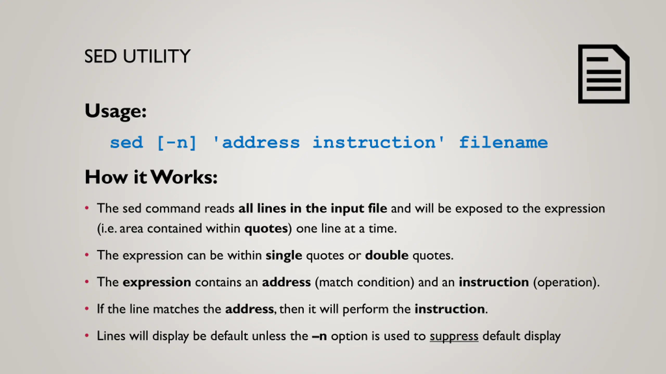 SED UTILITY Usage: sed [-n] 'address instruction' filename How it Works: The sed command reads all lines in the input file and will be exposed to the expression (i.e. area contained within quotes) one line at a time. The expression can be within single quotes or double quotes. The expression contains an address (match condition) and an instruction (operation). If the line matches the address, then it will perform the instruction. Lines will display be default unless the n option is used to suppress default display