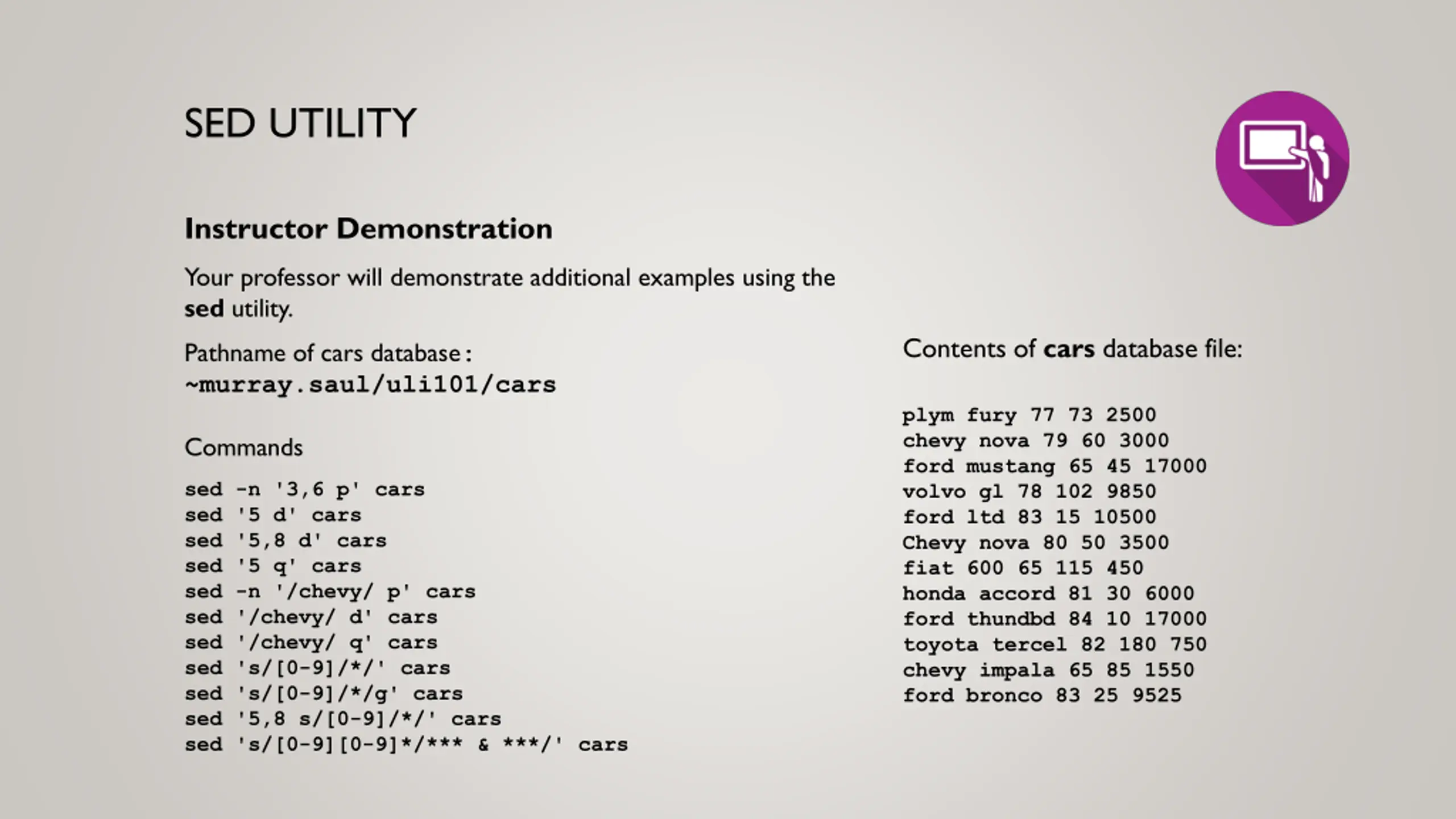 SED UTILITY Instructor Demonstration Your professor will demonstrate additional examples using the sed utility. Contents of cars database file: Pathname of cars database: ~murray.saul/uli101/cars plym fury 77 73 2500 chevy nova 79 60 3000 ford mustang 65 45 17000 volvo gl 78 102 9850 ford ltd 83 15 10500 Chevy nova 80 50 3500 fiat 600 65 115 450 honda accord 81 30 6000 ford thundbd 84 10 17000 toyota tercel 82 180 750 chevy impala 65 85 1550 ford bronco 83 25 9525 Commands sed -n '3,6 p' cars sed '5 d' cars sed '5,8 d' cars sed '5 q' cars sed -n '/chevy/ p' cars sed '/chevy/ d' cars sed '/chevy/ q' cars sed 's/[0-9]/*/' cars sed 's/[0-9]/*/g' cars sed '5,8 s/[0-9]/*/' cars sed 's/[0-9][0-9]*/*** & ***/' cars