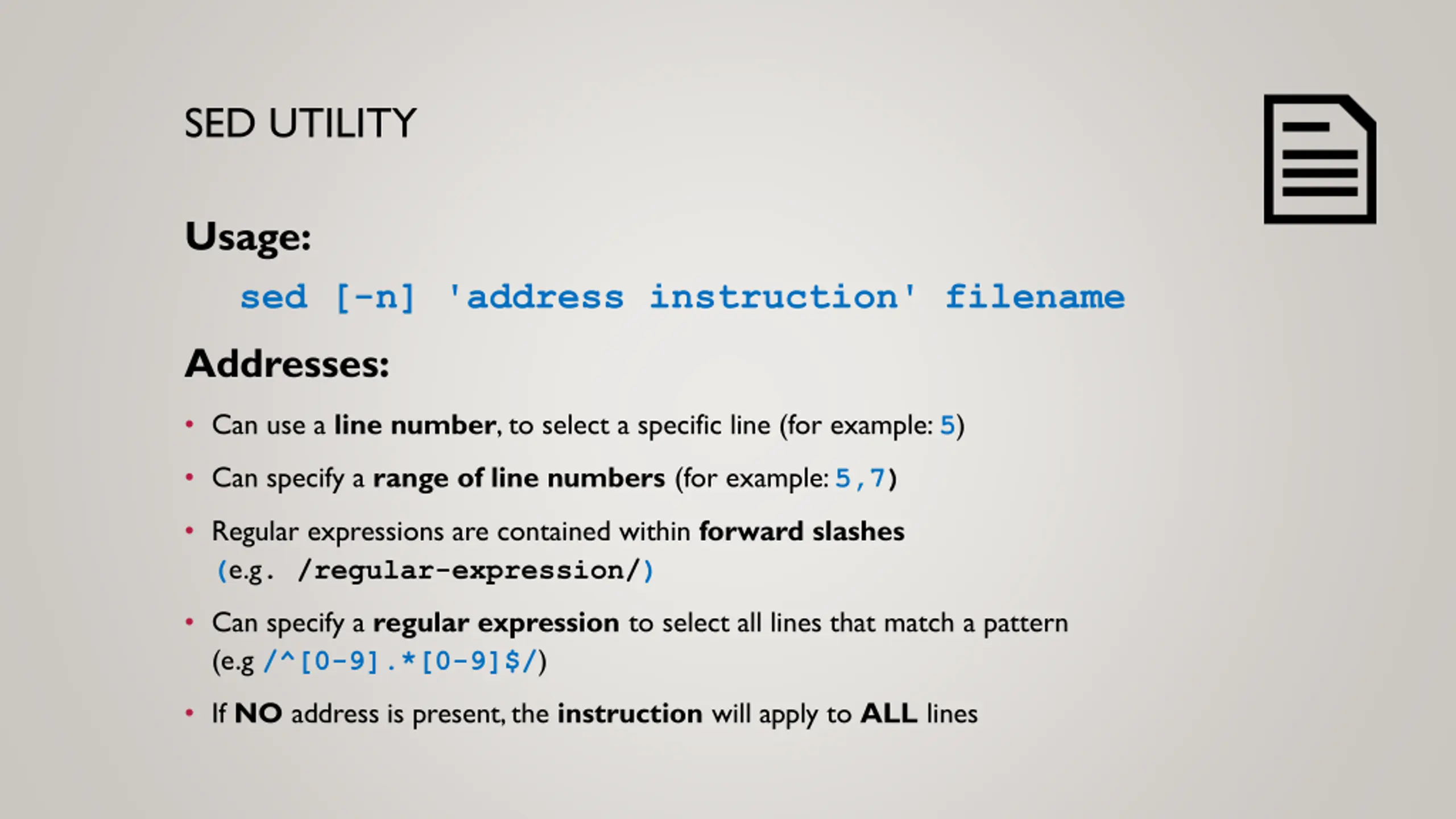 SED UTILITY Usage: sed [-n] 'address instruction' filename Addresses: Can use a line number, to select a specific line (for example: 5) Can specify a range of line numbers (for example: 5,7) Regular expressions are contained within forward slashes (e.g. /regular-expression/) Can specify a regular expression to select all lines that match a pattern (e.g /^[0-9].*[0-9]$/) If NO address is present, the instruction will apply to ALL lines