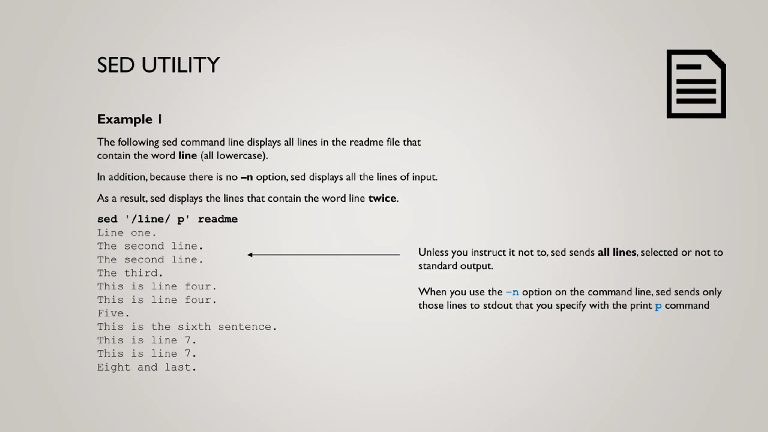 SED UTILITY Example 1 The following sed command line displays all lines in the readme file that contain the word line (all lowercase). In addition, because there is no n option, sed displays all the lines of input. As a result, sed displays the lines that contain the word line twice. sed '/line/ p' readme Line one. The second line. The second line. The third. This is line four. This is line four. Five. This is the sixth sentence. This is line 7. This is line 7. Eight and last. Unless you instruct it not to, sed sends all lines, selected or not to standard output. When you use the n option on the command line, sed sends only those lines to stdout that you specify with the print p command