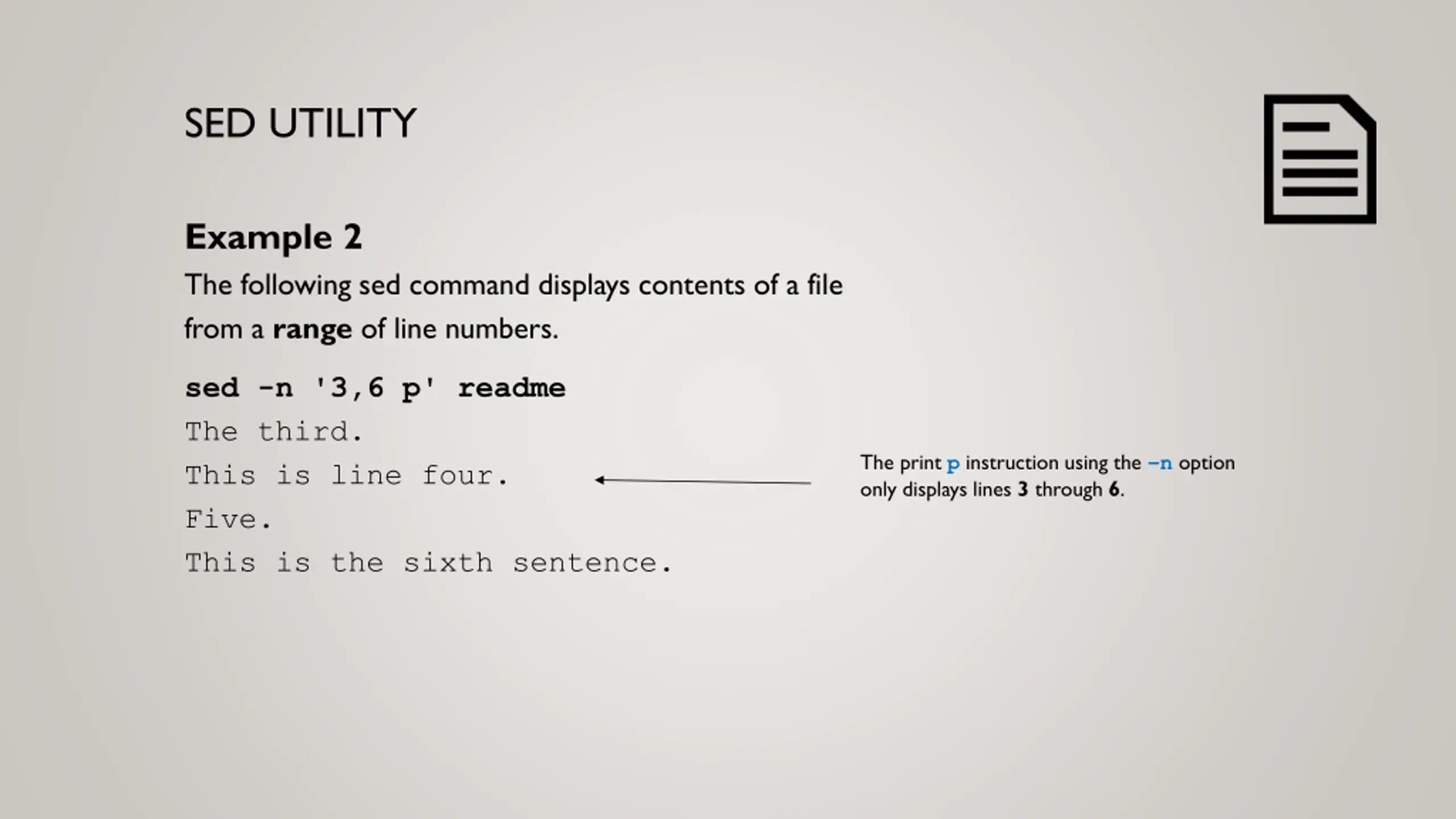 SED UTILITY Example 2 The following sed command displays contents of a file from a range of line numbers. sed -n '3,6 p' readme The third. This is line four. Five. This is the sixth sentence. The print p instruction using the n option only displays lines 3 through 6.